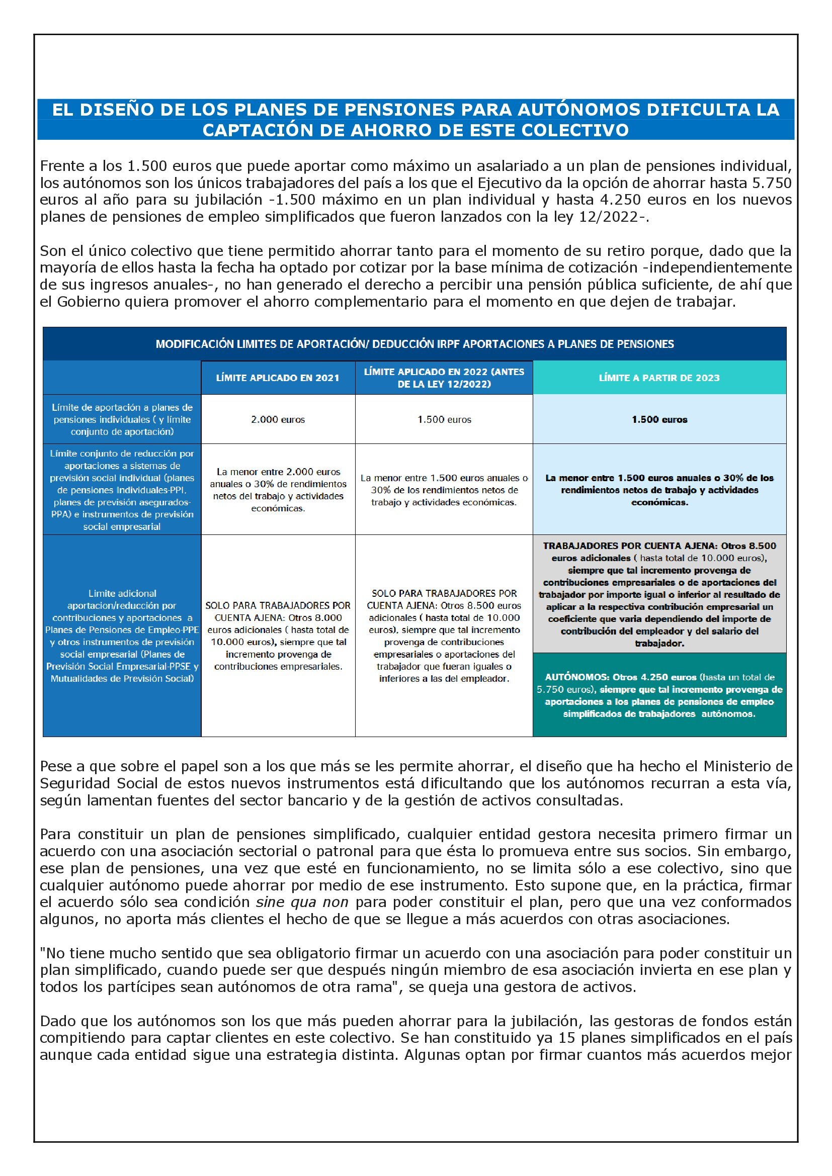 Frente a los 1.500 euros que puede aportar como máximo un asalariado a un plan de pensiones individual, los autónomos son los únicos trabajadores del país a los que el Ejecutivo da la opción de ahorrar hasta 5.750 euros al año para su jubilación -1.500 máximo en un plan individual y hasta 4.250 euros en los nuevos planes de pensiones de empleo simplificados que fueron lanzados con la ley 12/2022-.