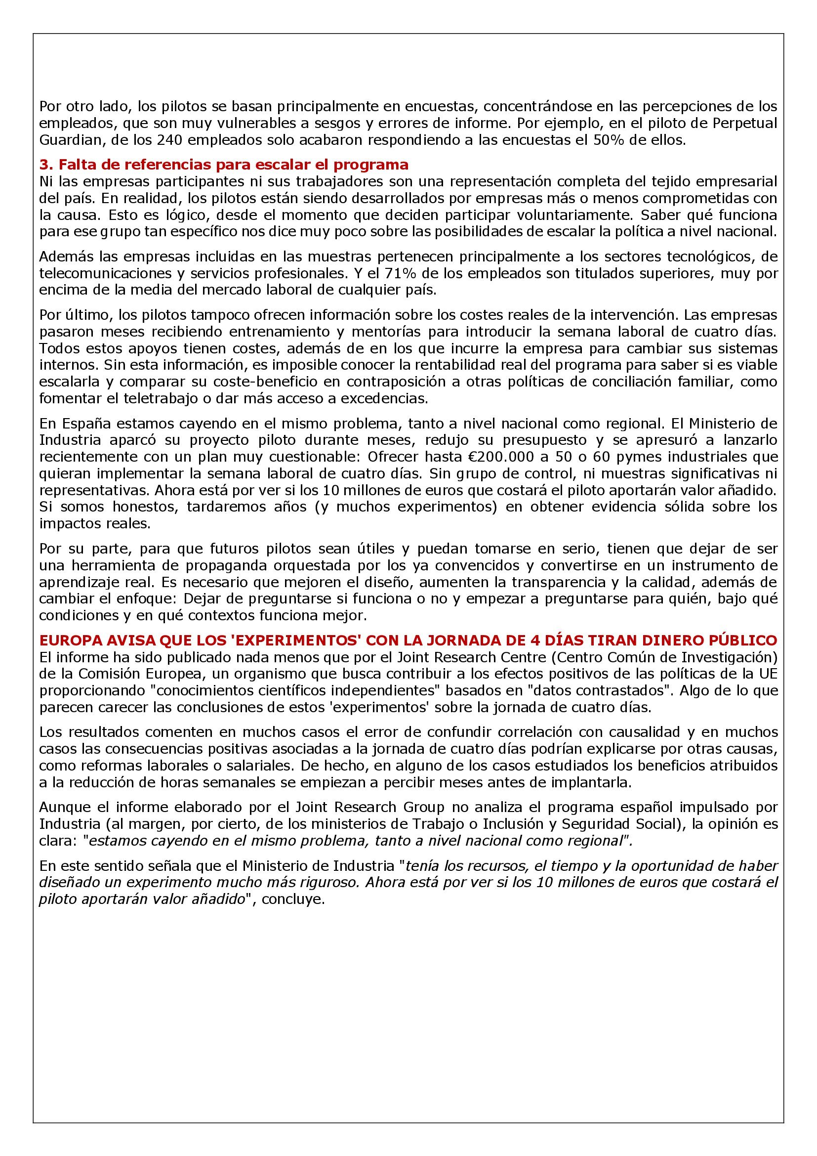 El informe ha sido publicado nada menos que por el Joint Research Centre (Centro Común de Investigación) de la Comisión Europea, un organismo que busca contribuir a los efectos positivos de las políticas de la UE proporcionando «conocimientos científicos independientes» basados en «datos contrastados». Algo de lo que parecen carecer las conclusiones de estos ‘experimentos’ sobre la jornada de cuatro días.