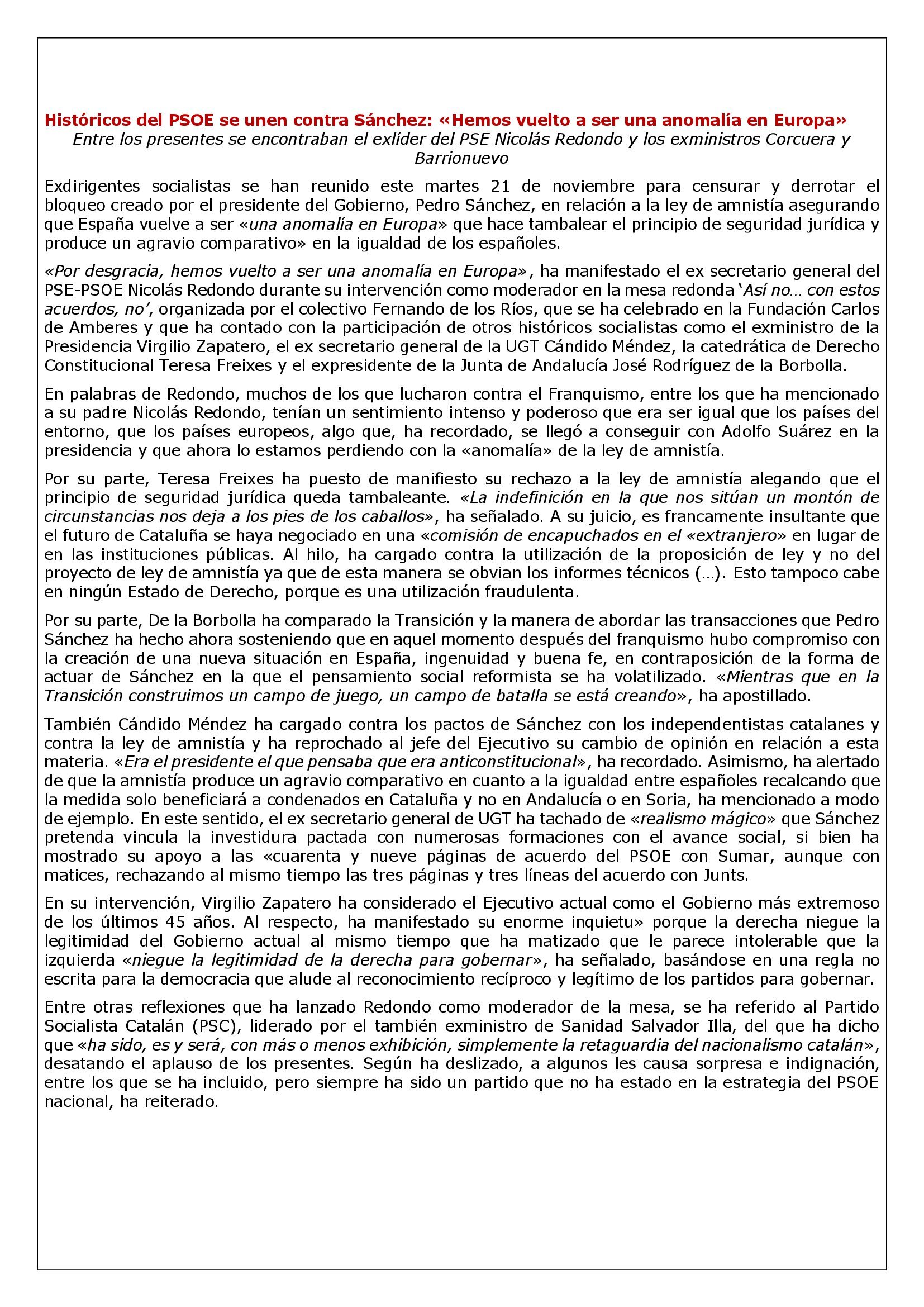 Exdirigentes socialistas se han reunido este martes 21 de noviembre para censurar y derrotar el bloqueo creado por el presidente del Gobierno, Pedro Sánchez, en relación a la ley de amnistía asegurando que España vuelve a ser «una anomalía en Europa» que hace tambalear el principio de seguridad jurídica y produce un agravio comparativo» en la igualdad de los españoles.