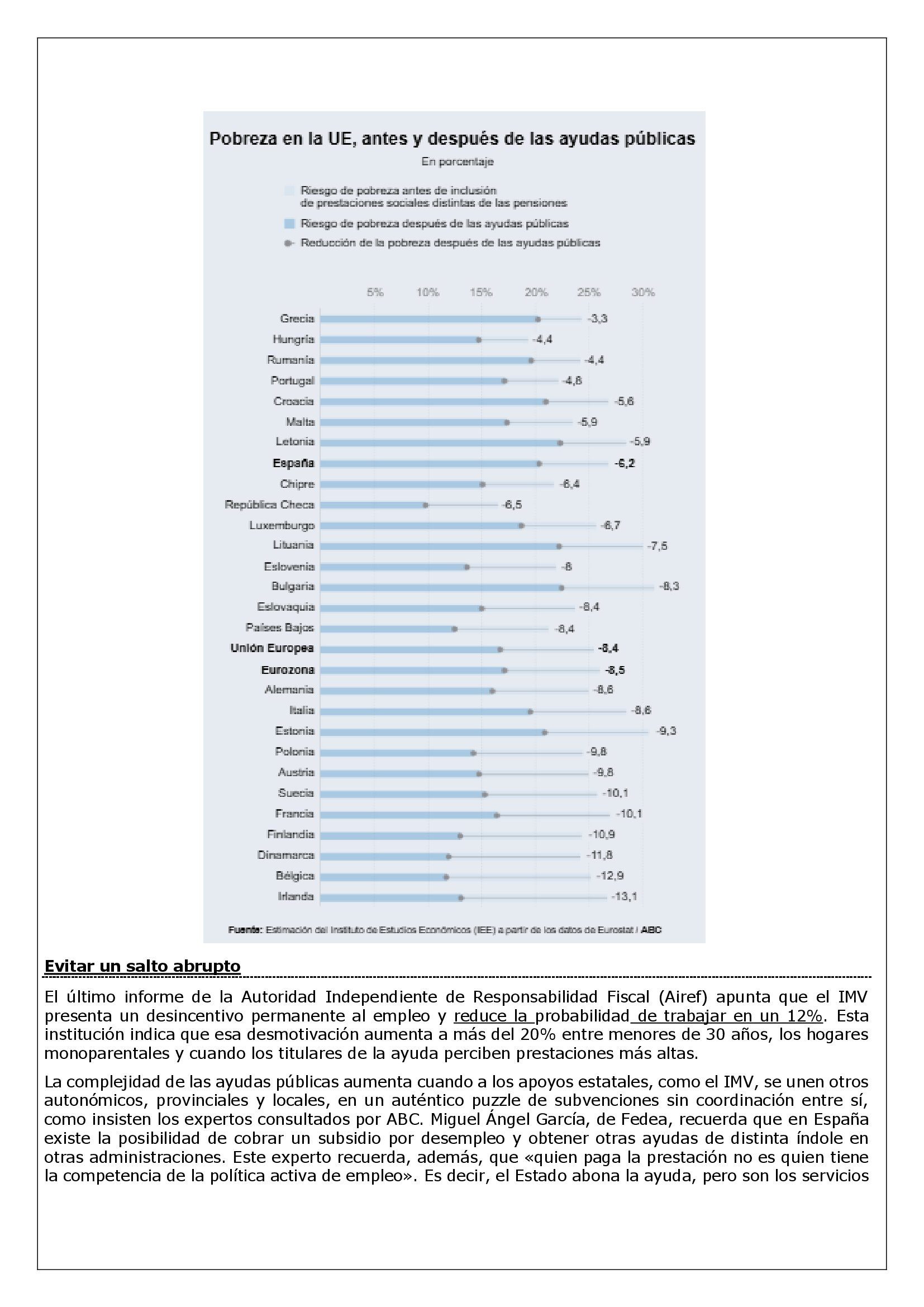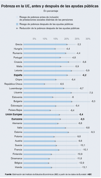 España país se sitúa en los últimos lugares de ese ranking al conseguir que la tasa de hogares en situación vulnerable baje poco más de 6 puntos porcentuales tras recibir apoyos públicos, según la estimación del Instituto de Estudios Económicos (IEE) a partir de los datos de Eurostat. Una brecha muy lejana a la que consigue recortar la media de la eurozona, donde el porcentaje de familias que mejoran su situación es del 8,5%, por no hablar de Irlanda (logra mejorarla un 13%) o Francia (10%). Coincide en este análisis con Jesús Fernández-Bravo, presidente de Economistas Asesores Laborales del Consejo General de Economistas: «El objetivo no es solo proteger renta, sino facilitar transiciones efectivas al empleo».