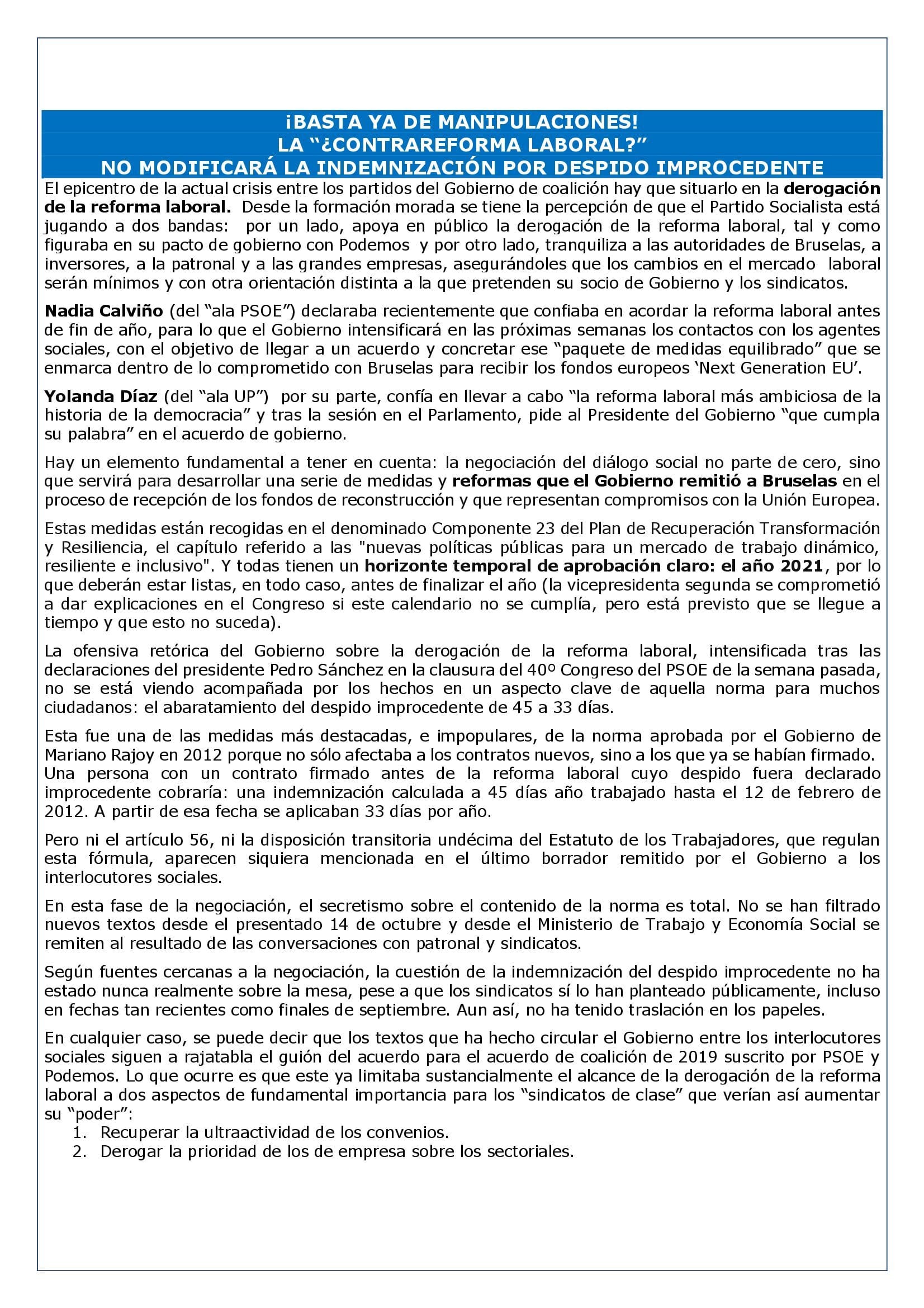 Nadia Calviño (del “ala PSOE”) declaraba recientemente que confiaba en acordar la reforma laboral antes de fin de año, para lo que el Gobierno intensificará en las próximas semanas los contactos con los agentes sociales, con el objetivo de llegar a un acuerdo y concretar ese “paquete de medidas equilibrado” que se enmarca dentro de lo comprometido con Bruselas para recibir los fondos europeos ‘Next Generation EU’.