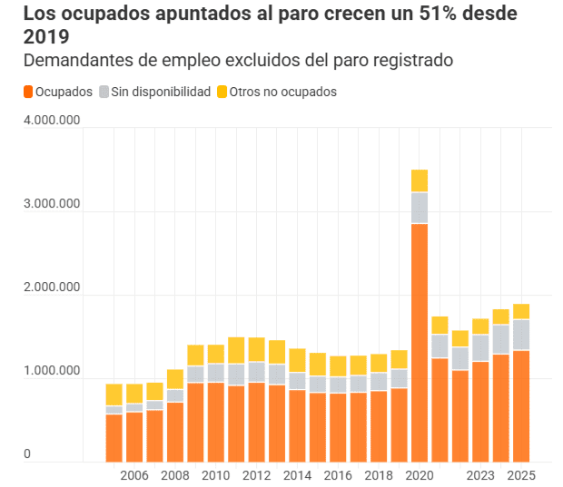 El SEPE aún no ha publicado los datos de paro completos para diciembre, con un desglose entre demandantes ocupados en sentido estricto o con relación laboral, pero los de los meses anteriores confirman un crecimiento excepcional de los segundos, que se convierten en el grupo mayoritario tras la pandemia. Y llevan a la paradoja de que los demandantes ocupados marquen en 2025 su segundo máximo histórico descontando 2020 y tras crecer un 51% desde los niveles de 2019. Hoy suponen el 31% de los demandantes, una cifra que solo se superó con los ERTEs, de 2020, cuando llegó al 38%.