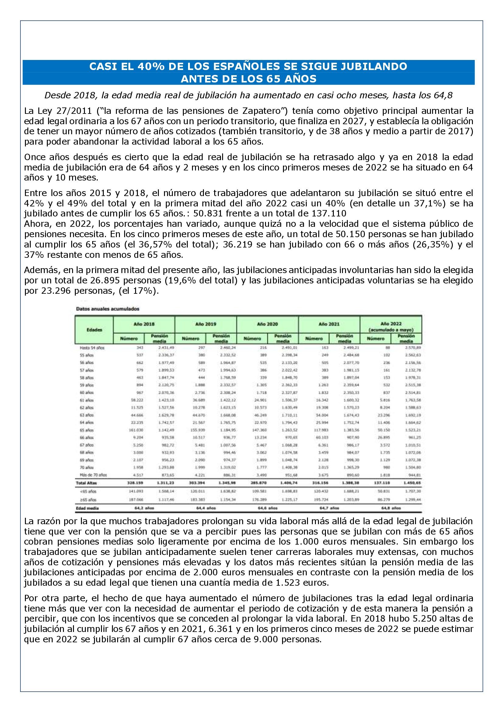 Entre los años 2015 y 2018, el número de trabajadores que adelantaron su jubilación se situó entre el 42% y el 49% del total y en la primera mitad del año 2022 casi un 40% (en detalle un 37,1%) se ha jubilado antes de cumplir los 65 años.: 50.831 frente a un total de 137.110