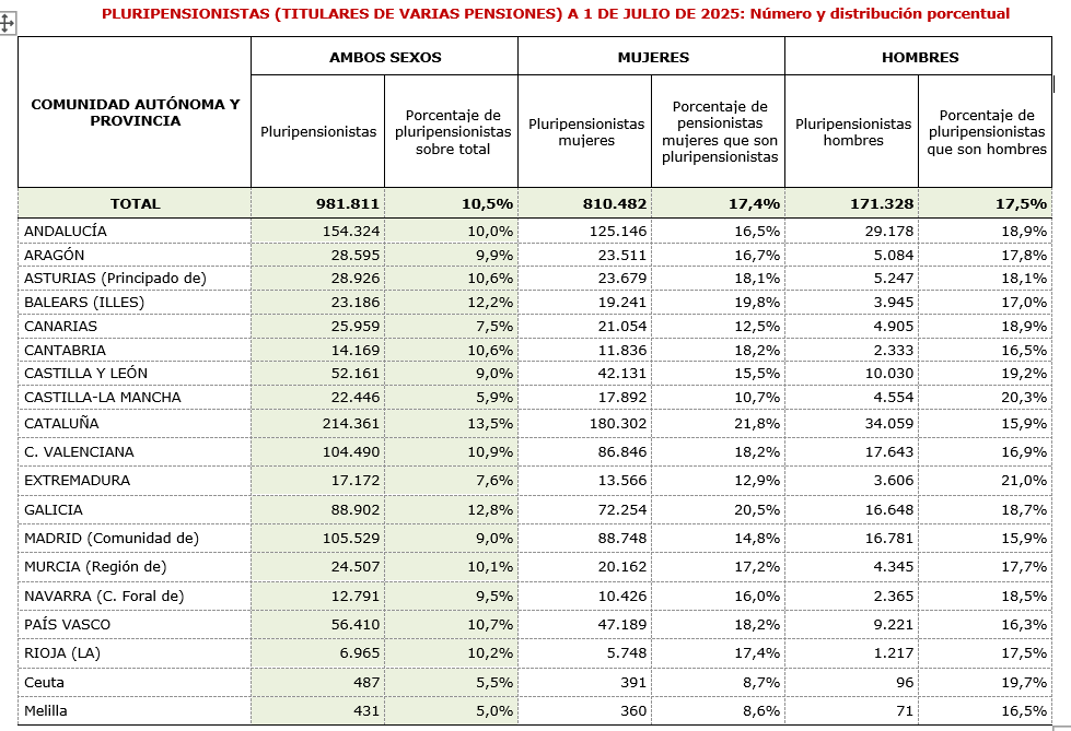 Los pluripensionistas representan en la actualidad el 10,5% del número de perceptores de algún tipo de pensión. Por regla general, combinan su correspondiente pensión de jubilación o incapacidad permanente con la de viudedad. Sin embargo, hay mucha disparidad entre comunidades autónomas. El mayor porcentaje de pluripensionistas sobre el total de pensionistas se da en Cataluña, con un 13,5%, tres puntos porcentuales por encima de la media; el menor, en Castilla-La Mancha, con apenas el 5,9%, casi la mitad que en el conjunto de España.