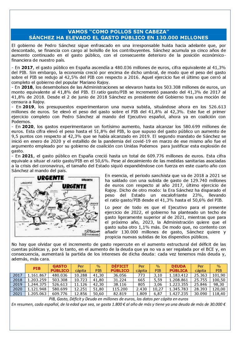VAMOS “COMO POLLOS SIN CABEZA”. SÁNCHEZ HA ELEVADO EL GASTO PÚBLICO EN 130.000 MILLONES
