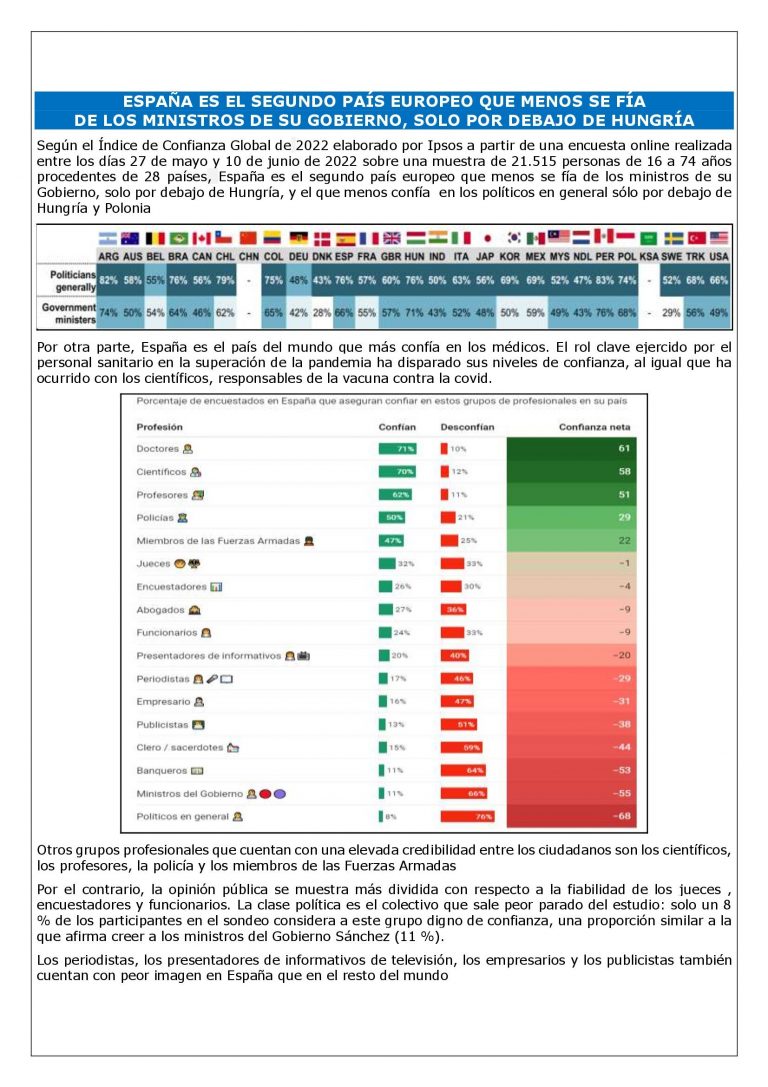 ESPAÑA ES EL SEGUNDO PAÍS EUROPEO QUE MENOS SE FÍA DE LOS MINISTROS DE SU GOBIERNO, SOLO POR DEBAJO DE HUNGRÍA