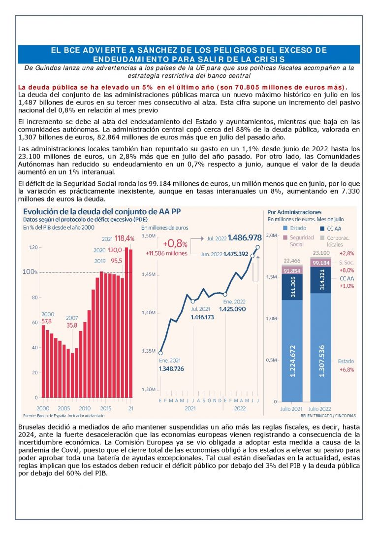 EL BCE ADVIERTE A SÁNCHEZ DE LOS PELIGROS DEL EXCESO DE ENDEUDAMIENTO PARA SALIR DE LA CRISIS