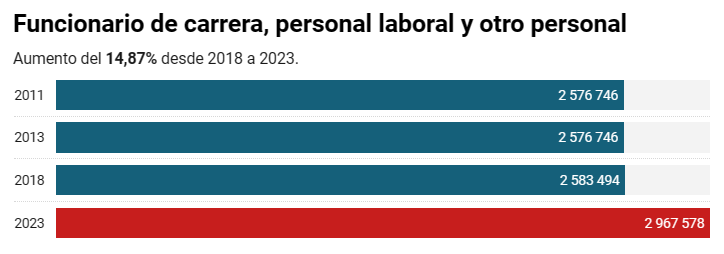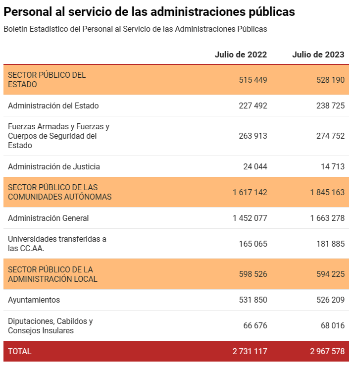 Entre julio de 2023 y julio de 2022 el número de empleados públicos se disparó casi un 9 %. Más de 236.461 servidores públicos adicionales, según el recuento que publica, cada seis meses, el Boletín Estadístico de personal al servicio de las administraciones públicas. Un alza más que notable si, por ejemplo, se compara con el incremento de apenas el 0,08 % registrado entre 2021 y 2022, cuando se incorporaron 2.241.
