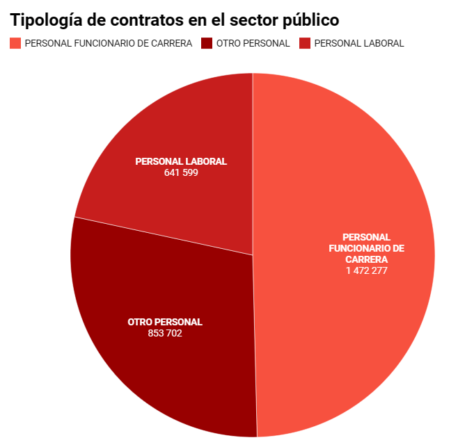 En función del tipo de contrato, la inmensa mayoría, 1.472.277, son personal funcionario de carrera; mientras que el personal laboral asciende a 641.599 personas; con 853.702 personas encuadradas dentro de la categoría «Otro personal».