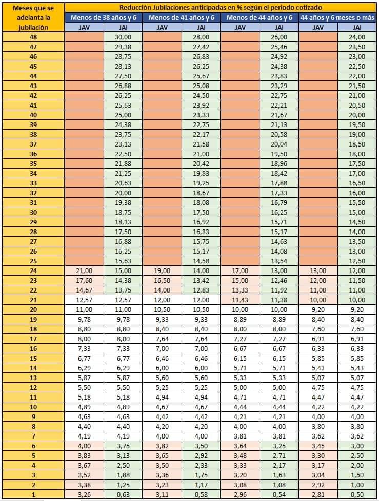 Tanto en la Voluntaria (JAV) como en la involuntaria (JAI) se aplican coeficientes reductores mensuales (cuanto más se adelante, mayor reducción).Eb la JAI las penalizaciones son más suaves que en la JVA