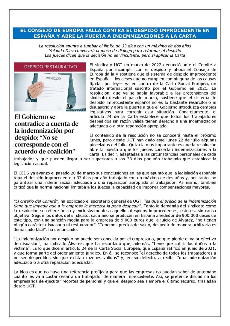 EL CONSEJO DE EUROPA FALLA CONTRA EL DESPIDO IMPROCEDENTE EN ESPAÑA Y ABRE LA PUERTA A INDEMNIZACIONES A LA CARTA