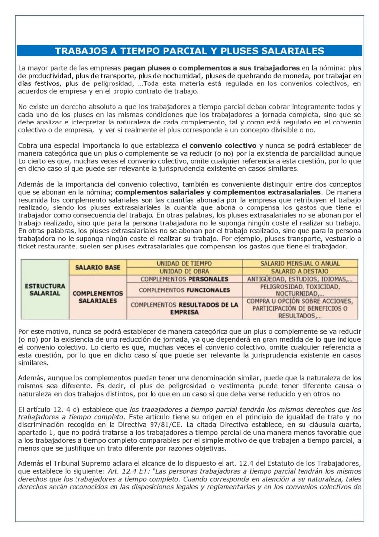 TRABAJOS A TIEMPO PARCIAL Y PLUSES SALARIALES