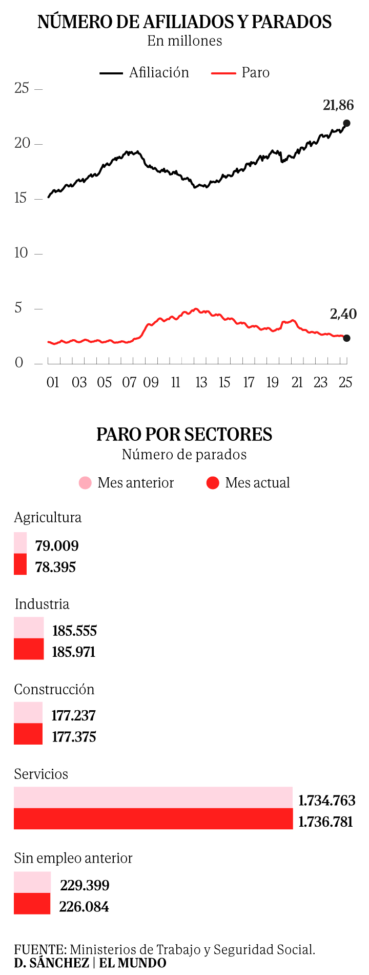 La educación ha sido el principal farolillo rojo de unos datos de empleo un tanto agridulces. De acuerdo con la información difundida ayer por los ministerios de Trabajo y Seguridad Social, la afiliación creció en julio, pero lo hizo en apenas 4.408 cotizantes, lejos de la media histórica en esta época de tirón turístico. Mientras, el paro se redujo en solo 1.357 desempleados respecto a junio, una caída muy leve en comparación con años anteriores y que se produce en un contexto de crecimiento del número de parados en el sector servicios en pleno pico de actividad veraniega.