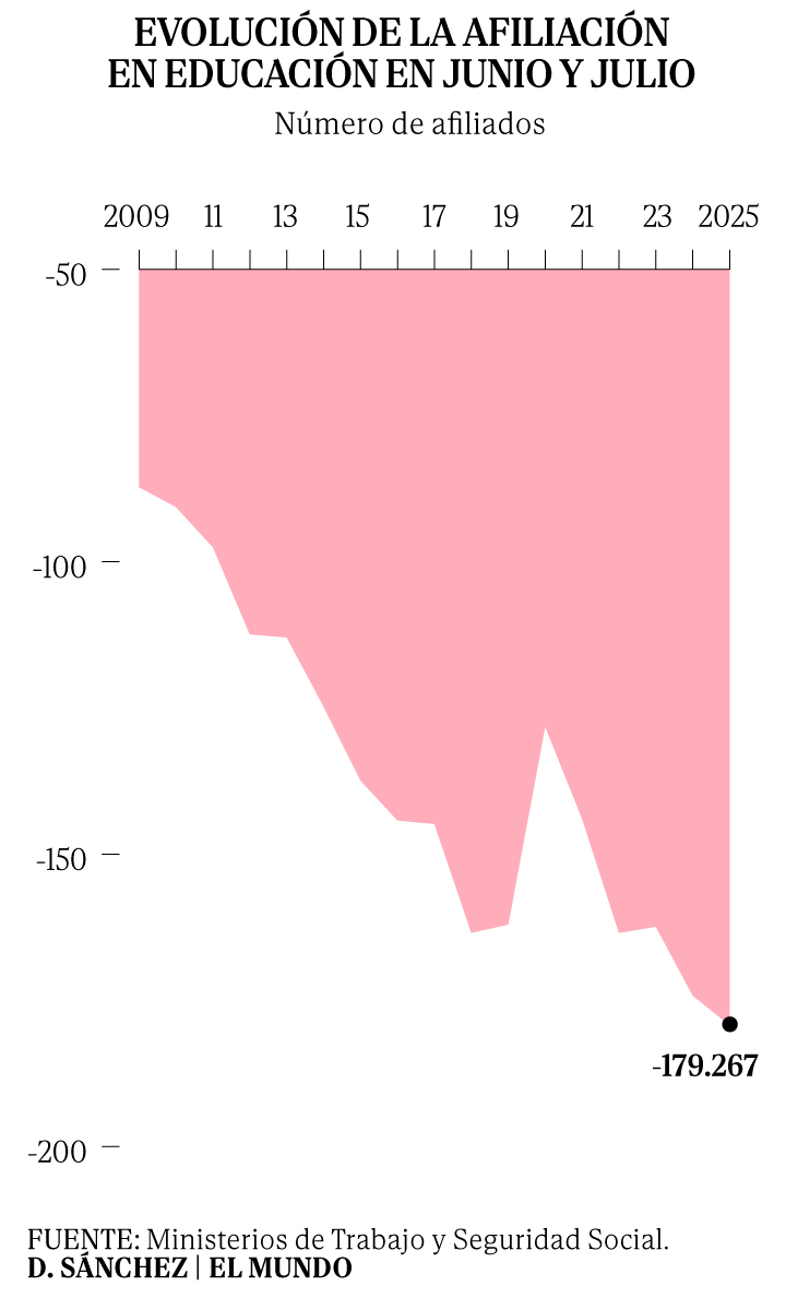 La playa, el chiringuito… y el despido masivo de profesores. Un clásico del verano que este año ha golpeado con especial dureza a los profesionales de la educación. Como viene siendo habitual, la afiliación a la Seguridad Social en el sector se ha hundido con el fin de curso, pero en esta ocasión la destrucción de empleo ha alcanzado un nivel nunca visto. Más de 184.000 personas -entre trabajadores por cuenta ajena y autónomos- perdieron su empleo en junio y julio, una cifra que rebasa todos los registros de la serie histórica analizada por EL MUNDO.