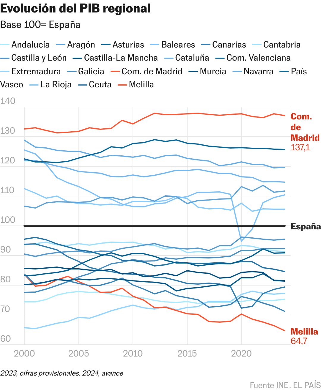 La economía española vuelve a destacar en el tablero global. España se ha convertido en el motor de una zona euro estancada y será, un año más, el país avanzado que más crecerá de todo el mundo. Detrás de estos datos agregados, sin embargo, hay otra imagen: la de un país donde el proceso de convergencia entre territorios está estancado. La brecha de riqueza entre comunidades se ha enquistado en niveles similares a los de inicios de siglo y el año pasado la diferencia en PIB per cápita entre el territorio más rico, Madrid, y el más rezagado, Andalucía, superó por primera vez los 20.000 euros, según los últimos datos provisionales de Contabilidad Regional de España publicados este martes por el Instituto Nacional de Estadística (INE).