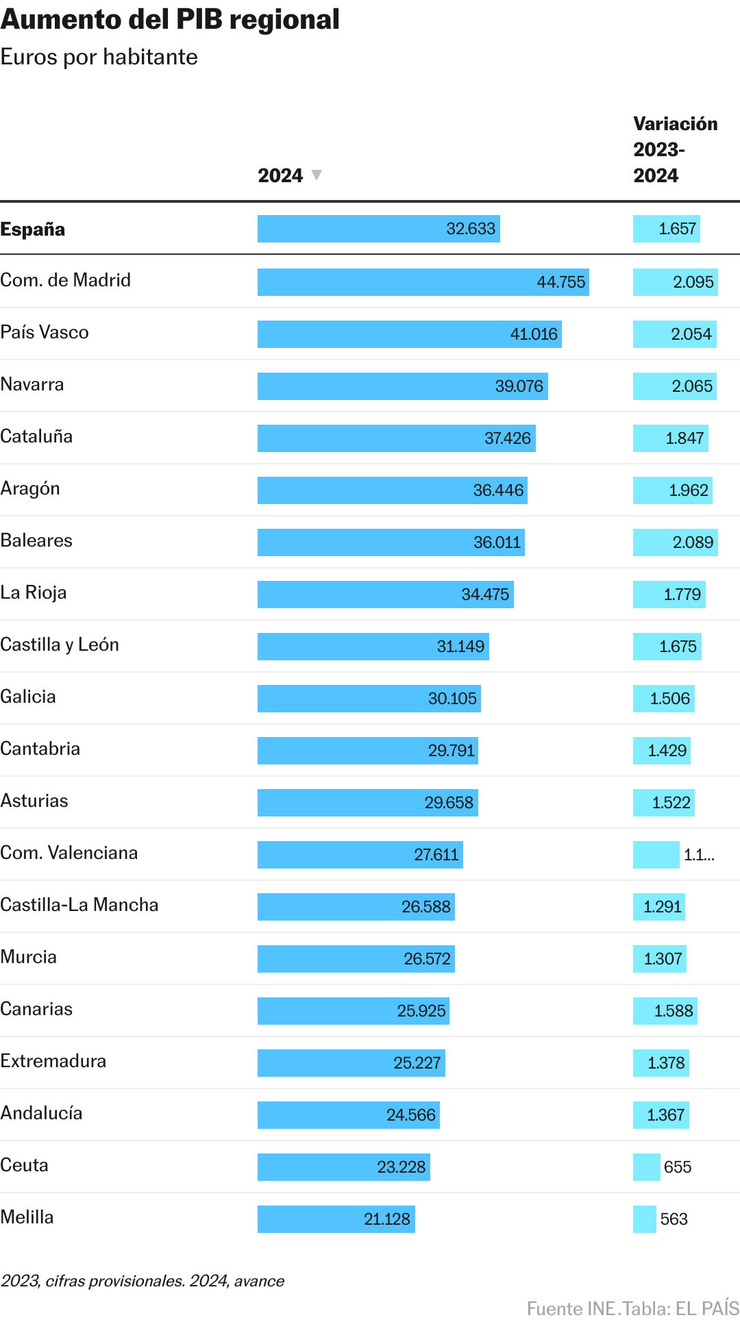 Siempre tomando como referencia los datos de 2024, los últimos disponibles, Murcia fue la comunidad que más creció, con un avance de su actividad del 4,5%, seguida por Canarias (4,4%) y Baleares (4,2%); en el otro extremo se encuentran Cantabria (2,3%), País Vasco (2,8%) y Extremadura (3%). Los PIB per cápita más elevados fueron los de Madrid, País Vasco (41.016 euros) —las únicas dos autonomías que superaron el promedio europeo— y Navarra (39.076 euros). Los menores se registraron en Andalucía (24.566 euros) y Extremadura (25.227 euros). En términos relativos, el PIB per cápita de la región capitalina fue un 37,1% superior a la media nacional, el vasco lo superó en un 25,7% y el navarro en un 19,7%.