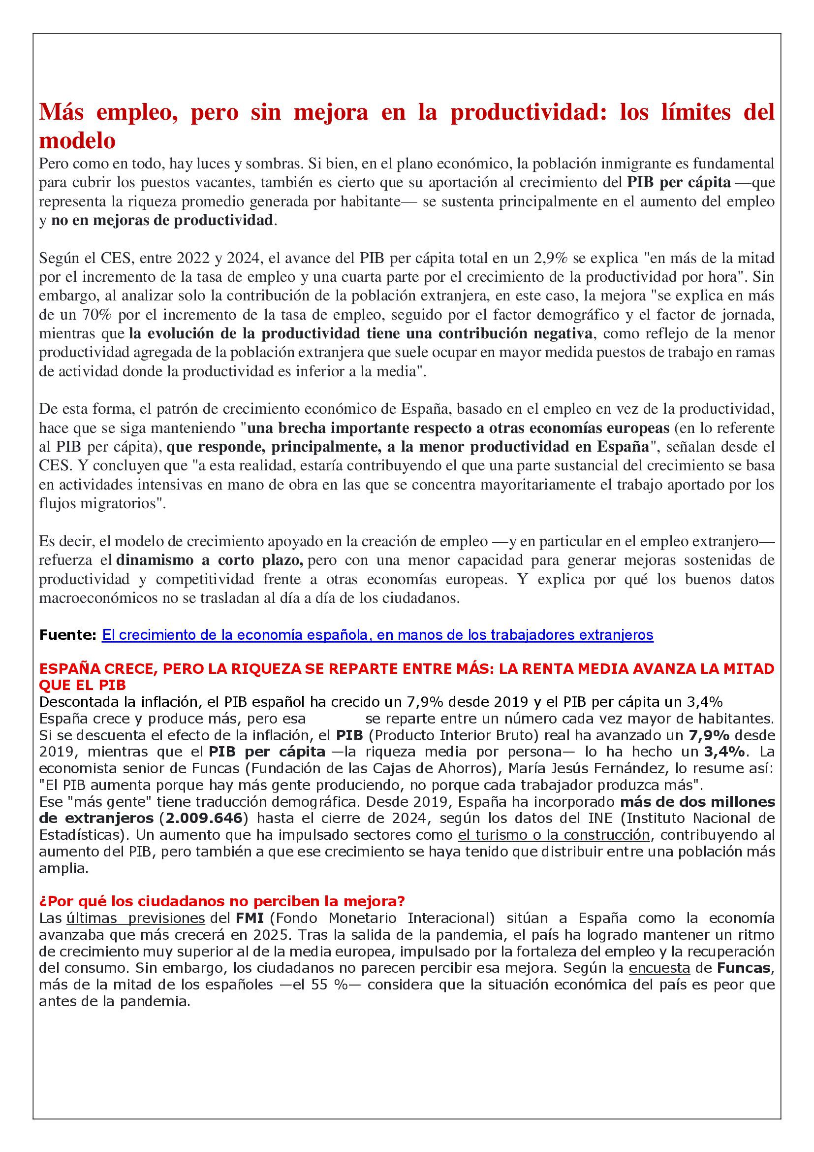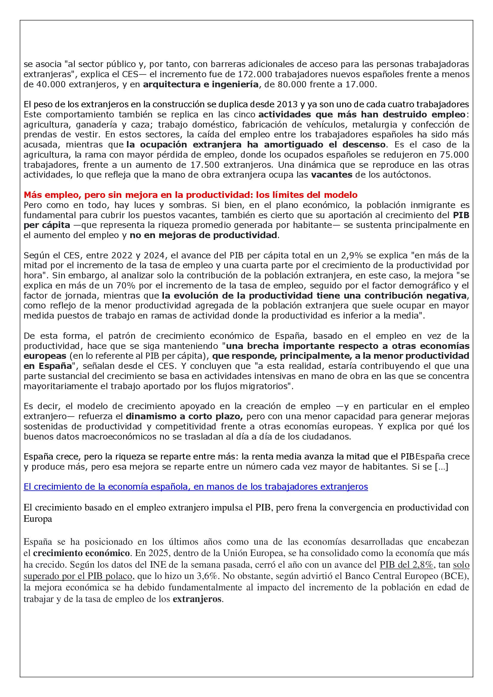 Según el CES, entre 2022 y 2024, el avance del PIB per cápita total en un 2,9% se explica «en más de la mitad por el incremento de la tasa de empleo y una cuarta parte por el crecimiento de la productividad por hora». Sin embargo, al analizar solo la contribución de la población extranjera, en este caso, la mejora «se explica en más de un 70% por el incremento de la tasa de empleo, seguido por el factor demográfico y el factor de jornada, mientras que la evolución de la productividad tiene una contribución negativa, como reflejo de la menor productividad agregada de la población extranjera que suele ocupar en mayor medida puestos de trabajo en ramas de actividad donde la productividad es inferior a la media».