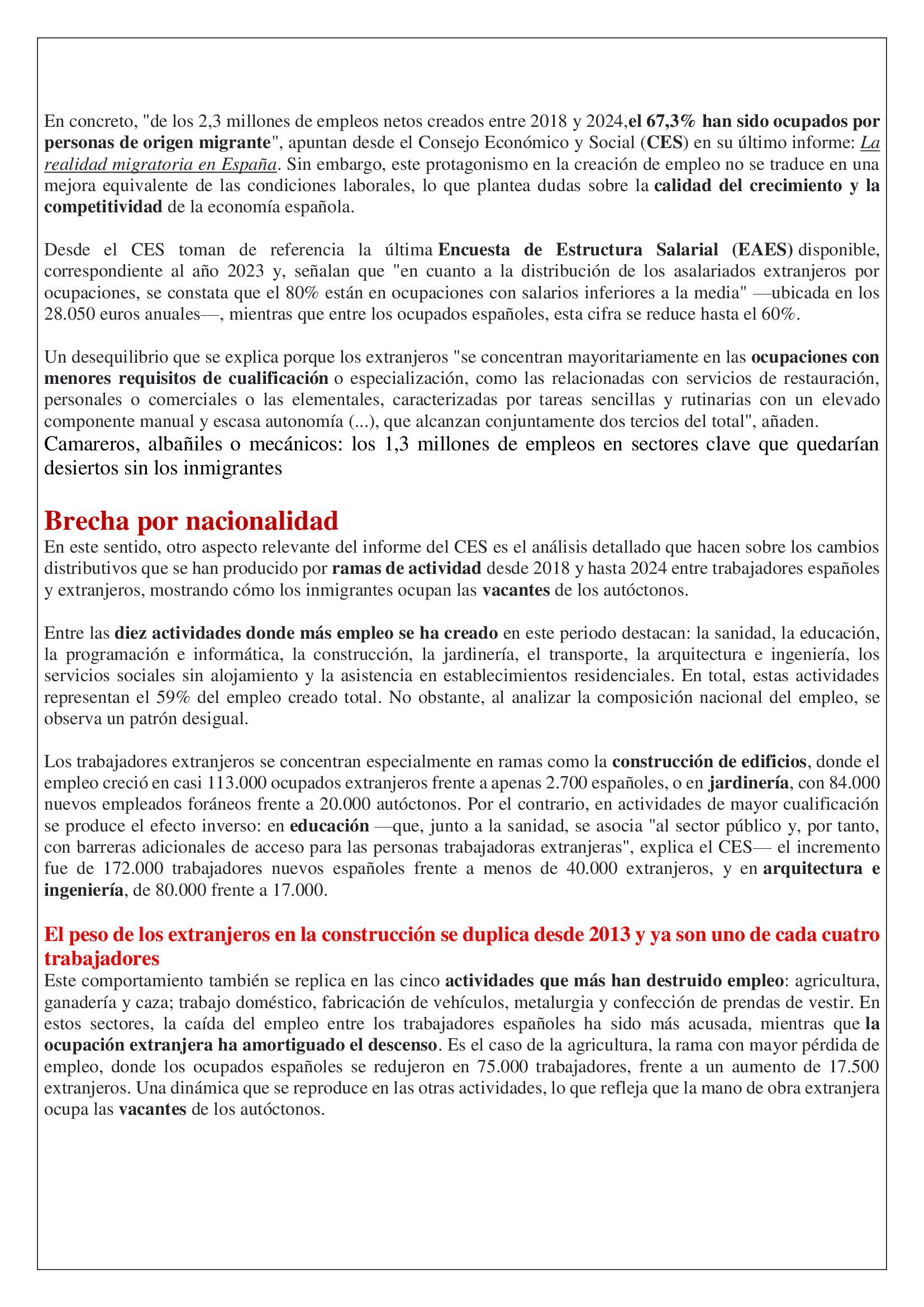 En este sentido, otro aspecto relevante del informe del CES es el análisis detallado que hacen sobre los cambios distributivos que se han producido por ramas de actividad desde 2018 y hasta 2024 entre trabajadores españoles y extranjeros, mostrando cómo los inmigrantes ocupan las vacantes de los autóctonos.