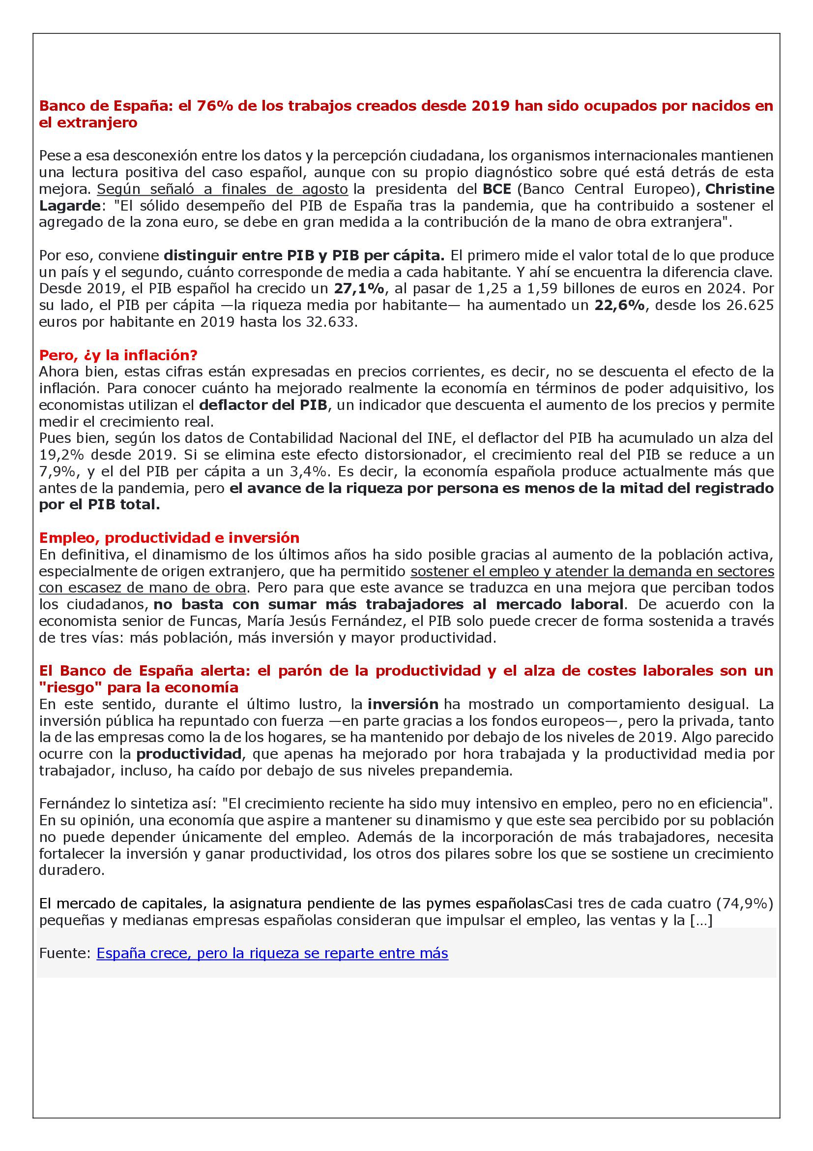 Pese a esa desconexión entre los datos y la percepción ciudadana, los organismos internacionales mantienen una lectura positiva del caso español, aunque con su propio diagnóstico sobre qué está detrás de esta mejora. Según señaló a finales de agosto la presidenta del BCE (Banco Central Europeo), Christine Lagarde: «El sólido desempeño del PIB de España tras la pandemia, que ha contribuido a sostener el agregado de la zona euro, se debe en gran medida a la contribución de la mano de obra extranjera».