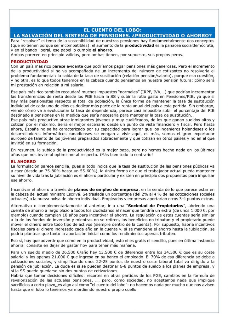 Habría que tomar decisiones difíciles: recortes en otras partidas de los PGE, cambios en la fórmula de revalorización de las actuales pensiones, …, pero, como sociedad, no aceptamos nada que implique sacrificios a corto plazo, es algo así como “el cuento del lobo”: no hacemos nada por mucho que nos avisen hasta que el lobo lo tenemos ya mordiendo nuestro propio cuello.