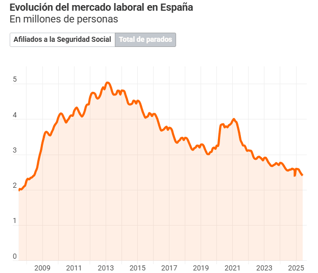 Esta mejora explica la paradoja de que el empleo crezca a niveles históricos pese a firmarse menos contratos. Eso sí, pese a este incremento de la ocupación el paro sigue lejos de su mínimo histórico. El dato de julio es el menor de los últimos 18 años, es decir, desde julio de 2008. Pero sigue estando medio millón por encima de la cifra anotada un año antes, justo antes de que estallara la burbuja inmobiliaria.