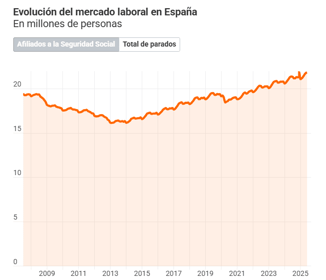 El tibio comportamiento de la afiliación contrasta con los datos de contratación. El número total de firmas registradas durante el mes de julio ha sido de 1,59 millones, un 4,43% más que hace un año. El total acumulado en los siete primeros meses de 2025 ha alcanzado una cifra de más de 9 millones, lo que supone un 0,89% más en 2024.