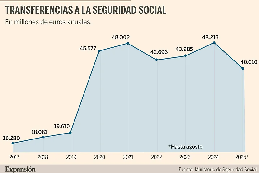Solo en los nueve primeros meses de 2025, la Seguridad Social ya ha necesitado un total de 40.010 millones de euros procedentes de impuestos para cubrir el gasto en pensiones. La partida de las transferencias del Estado gana peso en el mix de ingresos del sistema y constituye ya el segundo pilar fundamental, tras la recaudación de cotizaciones sociales, para sostener el desembolso mensual de prestaciones contributivas -especialmente las más de 10 millones de pensiones que perciben los algo más de 9 millones de beneficiarios del sistema-.