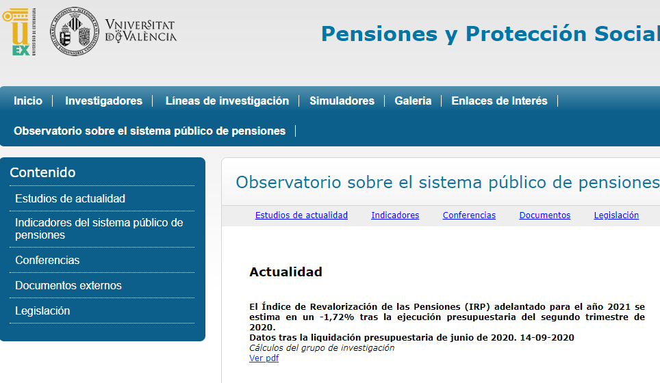 El cálculo realizado por la Universidad de Valencia sobre el valor adelantado del Índice de Revalorización de las Pensiones (IRP) para el año 2021 con la información que proporciona la ejecución presupuestaria de la Seguridad Social tras el tercer trimestre de 2020, está lejos de ser alentador: se estima que se sitúe en el -1,72%, frente al de 2020, que se situó en un -1,65%.