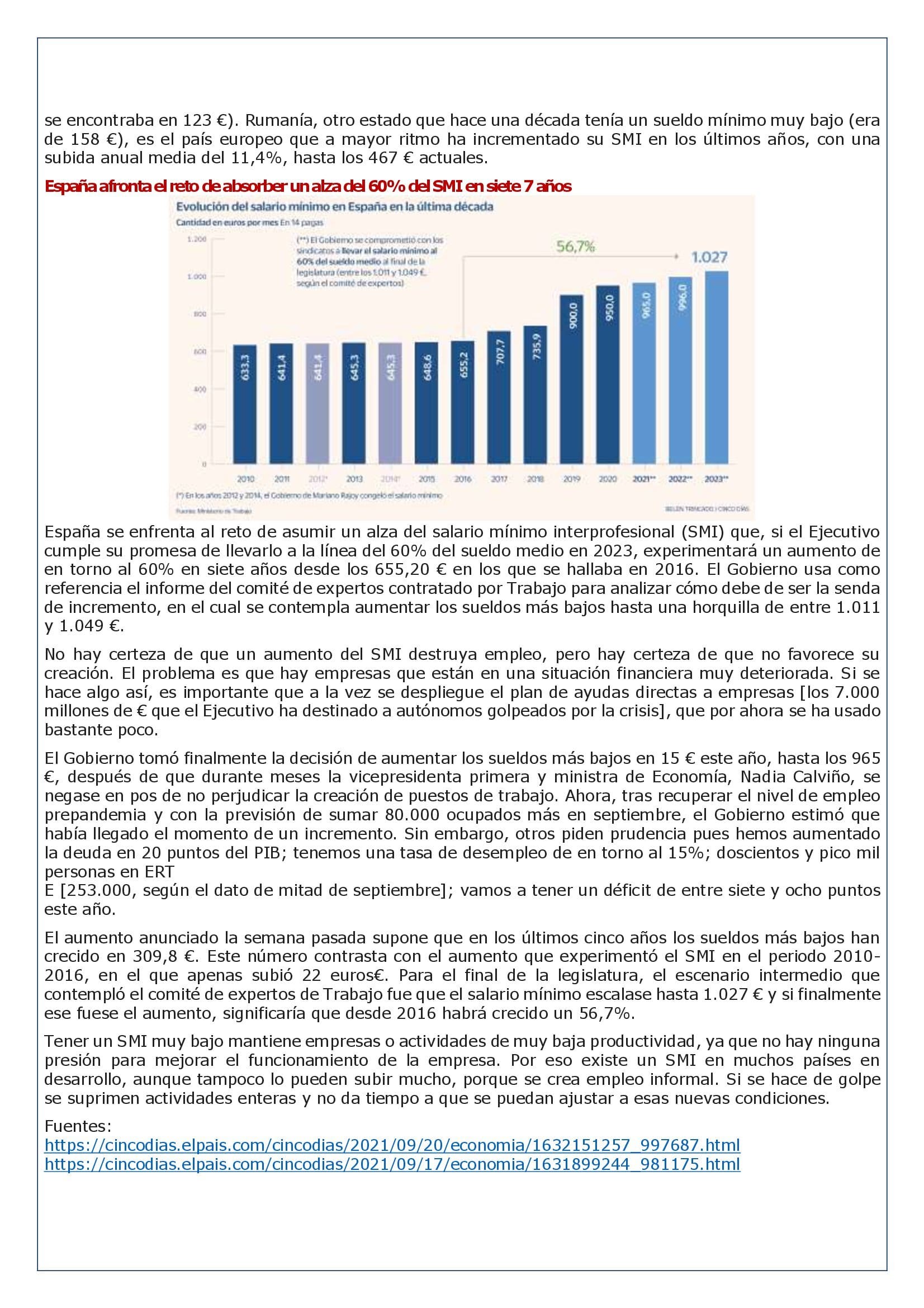 El Gobierno tomó finalmente la decisión de aumentar los sueldos más bajos en 15 € este año, hasta los 965 €, después de que durante meses la vicepresidenta primera y ministra de Economía, Nadia Calviño, se negase en pos de no perjudicar la creación de puestos de trabajo. Ahora, tras recuperar el nivel de empleo prepandemia y con la previsión de sumar 80.000 ocupados más en septiembre, el Gobierno estimó que había llegado el momento de un incremento. Sin embargo, otros piden prudencia pues hemos aumentado la deuda en 20 puntos del PIB; tenemos una tasa de desempleo de en torno al 15%; doscientos y pico mil personas en ERT
