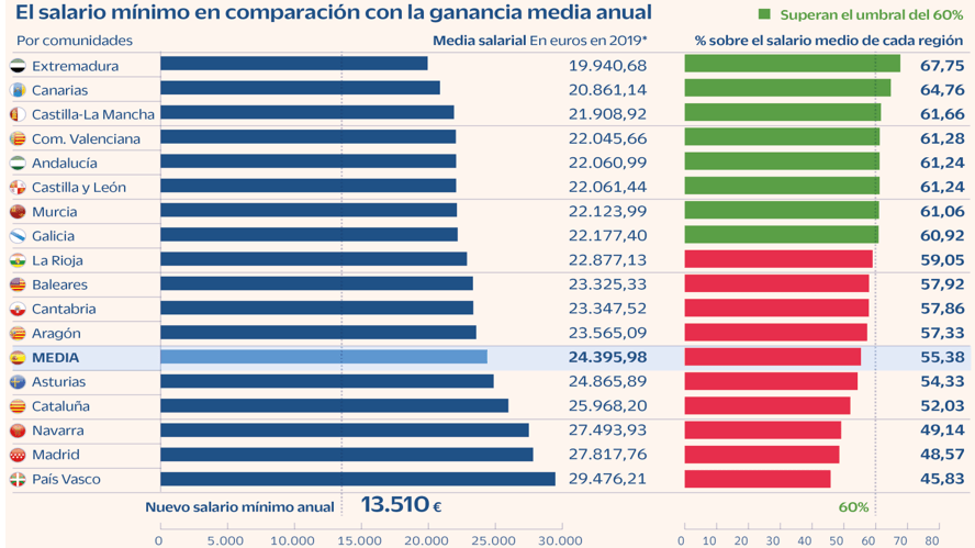 Tras Extremadura se sitúan Canarias, donde el SMI representa el 64,8% de su ganancia media anual, y Castilla-La Mancha, con el 61,7%. La comunidad valenciana (61,3%), Andalucía (61,2%), Castilla y León (61,2%), Murcia (61%) y Galicia (60,9%) completan la lista de las ocho autonomías donde el sueldo más bajo supera ya el 60% del salario medio, línea que se ha propuesto alcanzar el Ejecutivo al final de la legislatura.