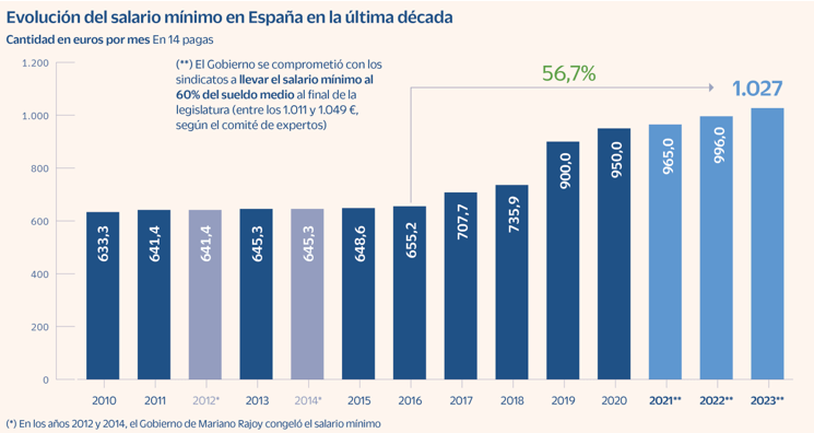 España se enfrenta al reto de asumir un alza del salario mínimo interprofesional (SMI) que, si el Ejecutivo cumple su promesa de llevarlo a la línea del 60% del sueldo medio en 2023, experimentará un aumento de en torno al 60% en siete años desde los 655,20 € en los que se hallaba en 2016. El Gobierno usa como referencia el informe del comité de expertos contratado por Trabajo para analizar cómo debe de ser la senda de incremento, en el cual se contempla aumentar los sueldos más bajos hasta una horquilla de entre 1.011 y 1.049 €.