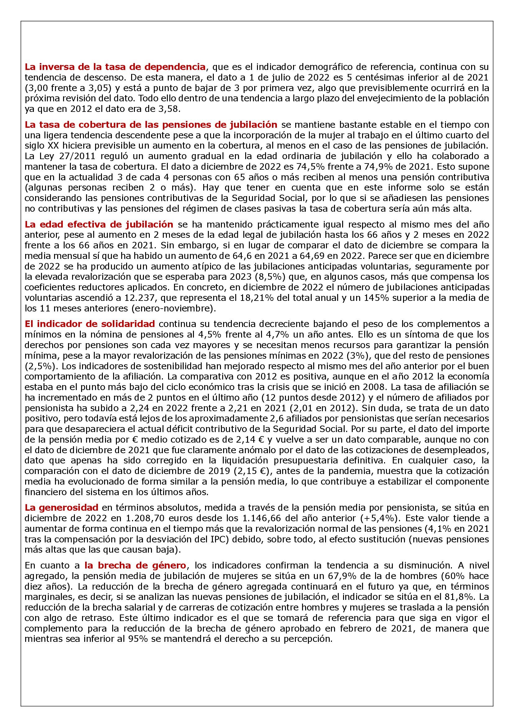 El indicador de solidaridad continua su tendencia decreciente bajando el peso de los complementos a mínimos en la nómina de pensiones al 4,5% frente al 4,7% un año antes. Ello es un síntoma de que los derechos por pensiones son cada vez mayores y se necesitan menos recursos para garantizar la pensión mínima, pese a la mayor revalorización de las pensiones mínimas en 2022 (3%), que del resto de pensiones (2,5%). Los indicadores de sostenibilidad han mejorado respecto al mismo mes del año anterior por el buen comportamiento de la afiliación. La comparativa con 2012 es positiva, aunque en el año 2012 la economía estaba en el punto más bajo del ciclo económico tras la crisis que se inició en 2008. La tasa de afiliación se ha incrementado en más de 2 puntos en el último año (12 puntos desde 2012) y el número de afiliados por pensionista ha subido a 2,24 en 2022 frente a 2,21 en 2021 (2,01 en 2012). Sin duda, se trata de un dato positivo, pero todavía está lejos de los aproximadamente 2,6 afiliados por pensionistas que serían necesarios para que desapareciera el actual déficit contributivo de la Seguridad Social. Por su parte, el dato del importe de la pensión media por € medio cotizado es de 2,14 € y vuelve a ser un dato comparable, aunque no con el dato de diciembre de 2021 que fue claramente anómalo por el dato de las cotizaciones de desempleados, dato que apenas ha sido corregido en la liquidación presupuestaria definitiva. En cualquier caso, la comparación con el dato de diciembre de 2019 (2,15 €), antes de la pandemia, muestra que la cotización media ha evolucionado de forma similar a la pensión media, lo que contribuye a estabilizar el componente financiero del sistema en los últimos años.