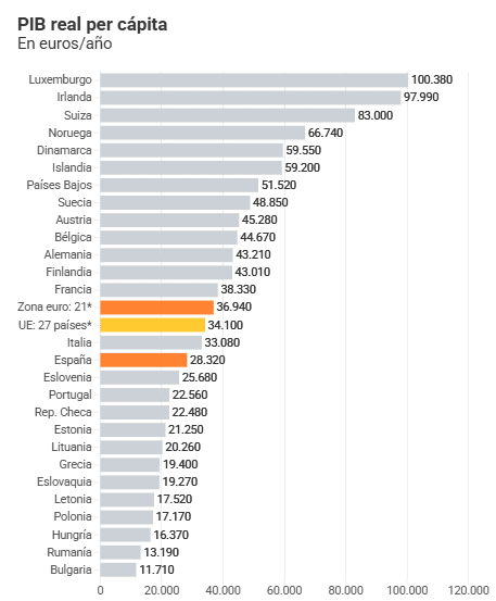 Fuente:El PIB per cápita se estanca y se sitúa un 30% por debajo del promedio europeo