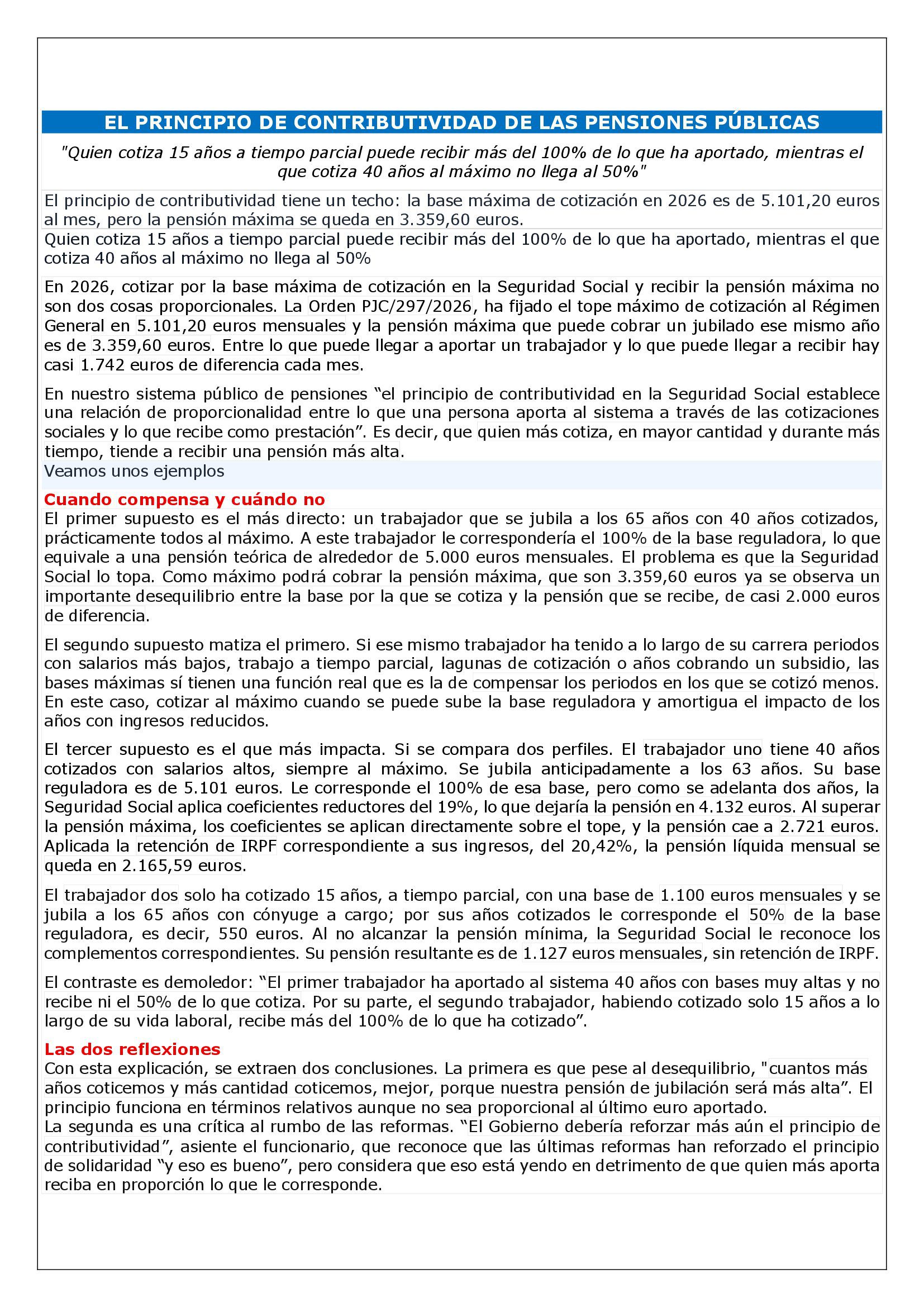 El principio de contributividad tiene un techo: la base máxima de cotización en 2026 es de 5.101,20 euros al mes, pero la pensión máxima se queda en 3.359,60 euros.
