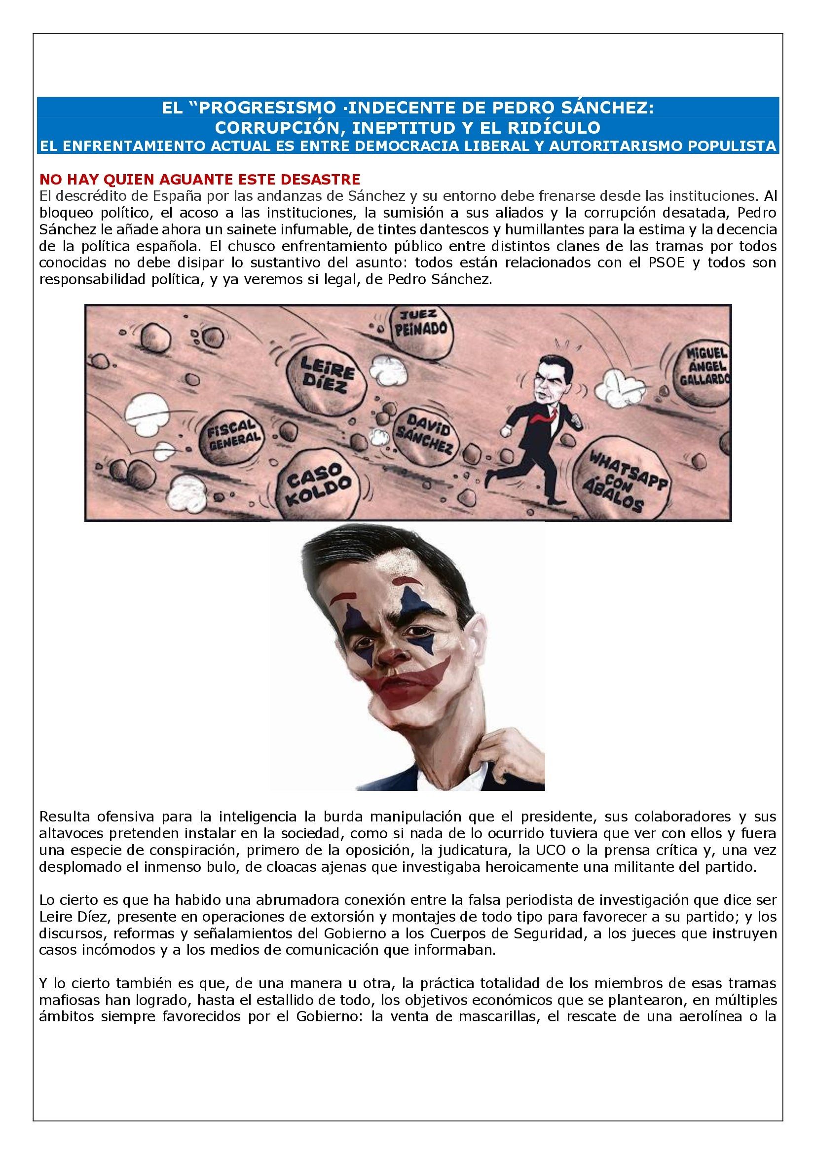 El descrédito de España por las andanzas de Sánchez y su entorno debe frenarse desde las instituciones. Al bloqueo político, el acoso a las instituciones, la sumisión a sus aliados y la corrupción desatada, Pedro Sánchez le añade ahora un sainete infumable, de tintes dantescos y humillantes para la estima y la decencia de la política española. El chusco enfrentamiento público entre distintos clanes de las tramas por todos conocidas no debe disipar lo sustantivo del asunto: todos están relacionados con el PSOE y todos son responsabilidad política, y ya veremos si legal, de Pedro Sánchez.