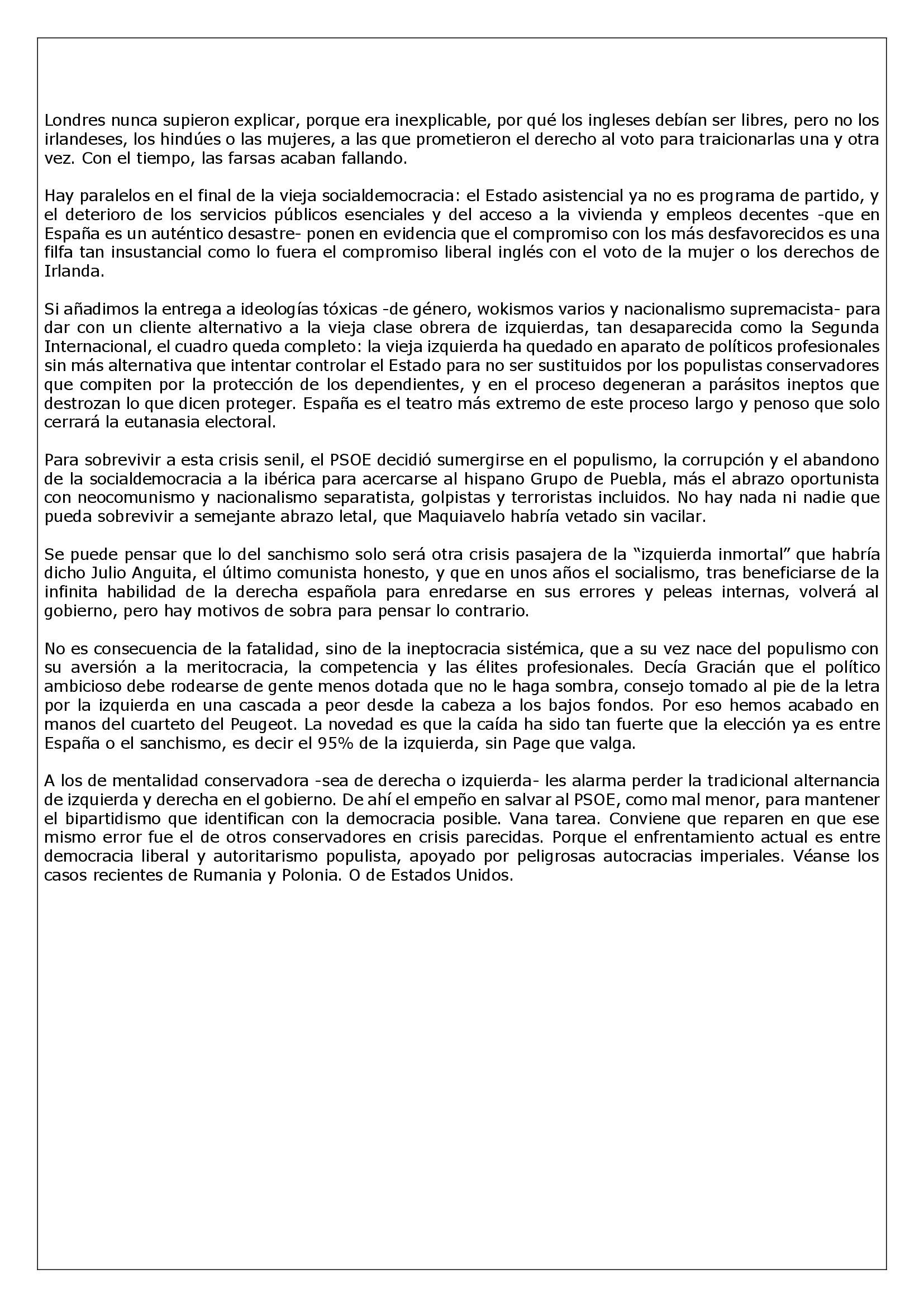 Se puede pensar que lo del sanchismo solo será otra crisis pasajera de la “izquierda inmortal” que habría dicho Julio Anguita, el último comunista honesto, y que en unos años el socialismo, tras beneficiarse de la infinita habilidad de la derecha española para enredarse en sus errores y peleas internas, volverá al gobierno, pero hay motivos de sobra para pensar lo contrario.