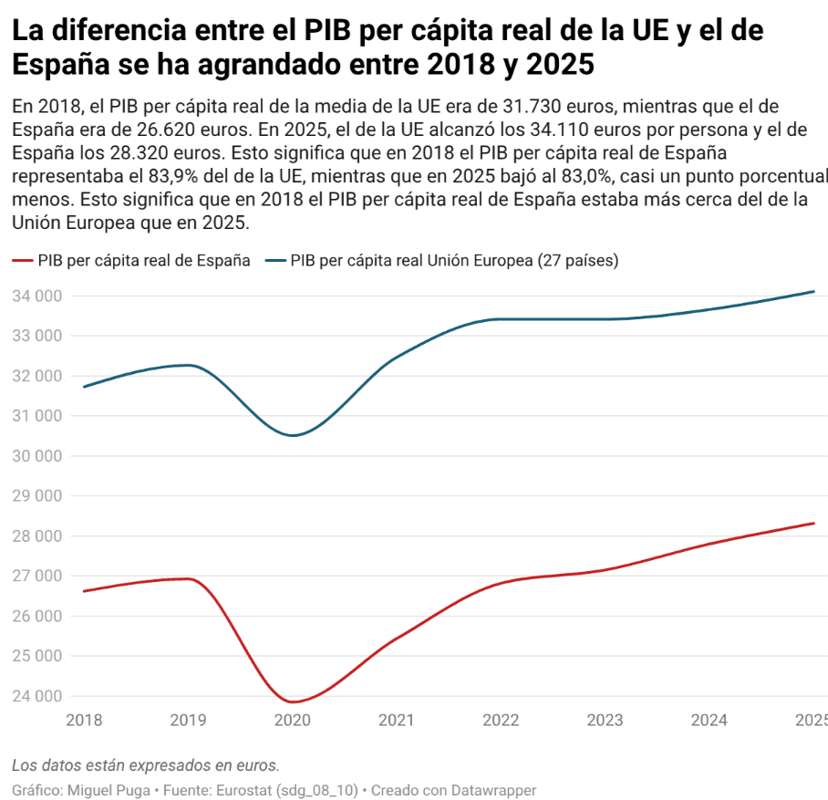 En este tiempo, el PIB per cápita europeo ascendió de media un 40,54% y todos los rezagados o países más pobres, salvo los mencionados, han crecido a un ritmo más rápido. En el caso de España, el crecimiento acumulado ha sido del 39,05%. En cantidades absolutas, en 2017, nos separaban de nuestros socios 2.200 euros de renta anual, cifra que se ha elevado en 1.300 euros hasta los 3.500 actuales —la brecha ha sido idéntica en 2025 y en el ejercicio anterior—.