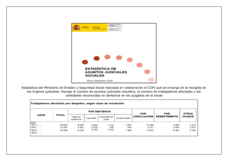 Estadística del Ministerio de Empleo y Seguridad Social realizada en colaboración el CGPJ que se encarga de la recogida en los órganos judiciales. Recoge el número de asuntos judiciales resueltos, el número de trabajadores afectados y las cantidades reconocidas en sentencia en los juzgados de lo social