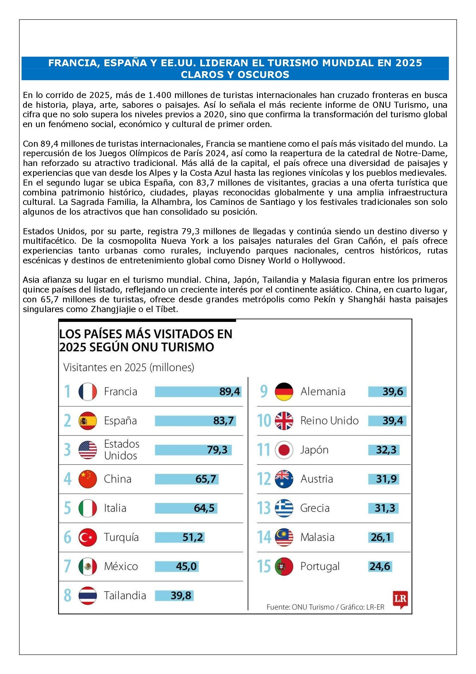 Francia, España y EE.UU. lideran el turismo mundial en 2025
