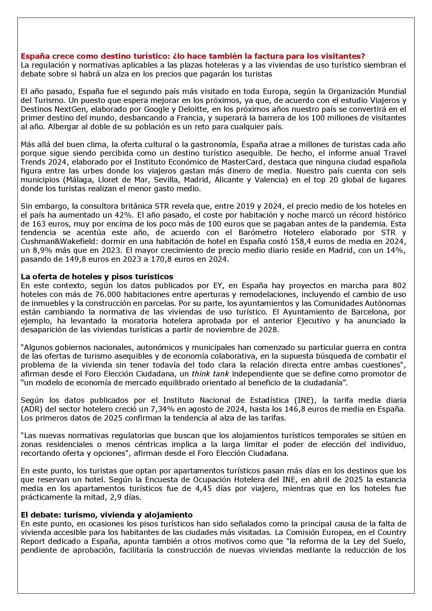 En definitiva, «si apostamos por crear soluciones innovadoras y de calidad para el turismo, en lugar de imponer más restricciones, podremos preparar a España de manera equilibrada y sostenible para que se convierta en el principal hub turístico del mundo», concluyen.