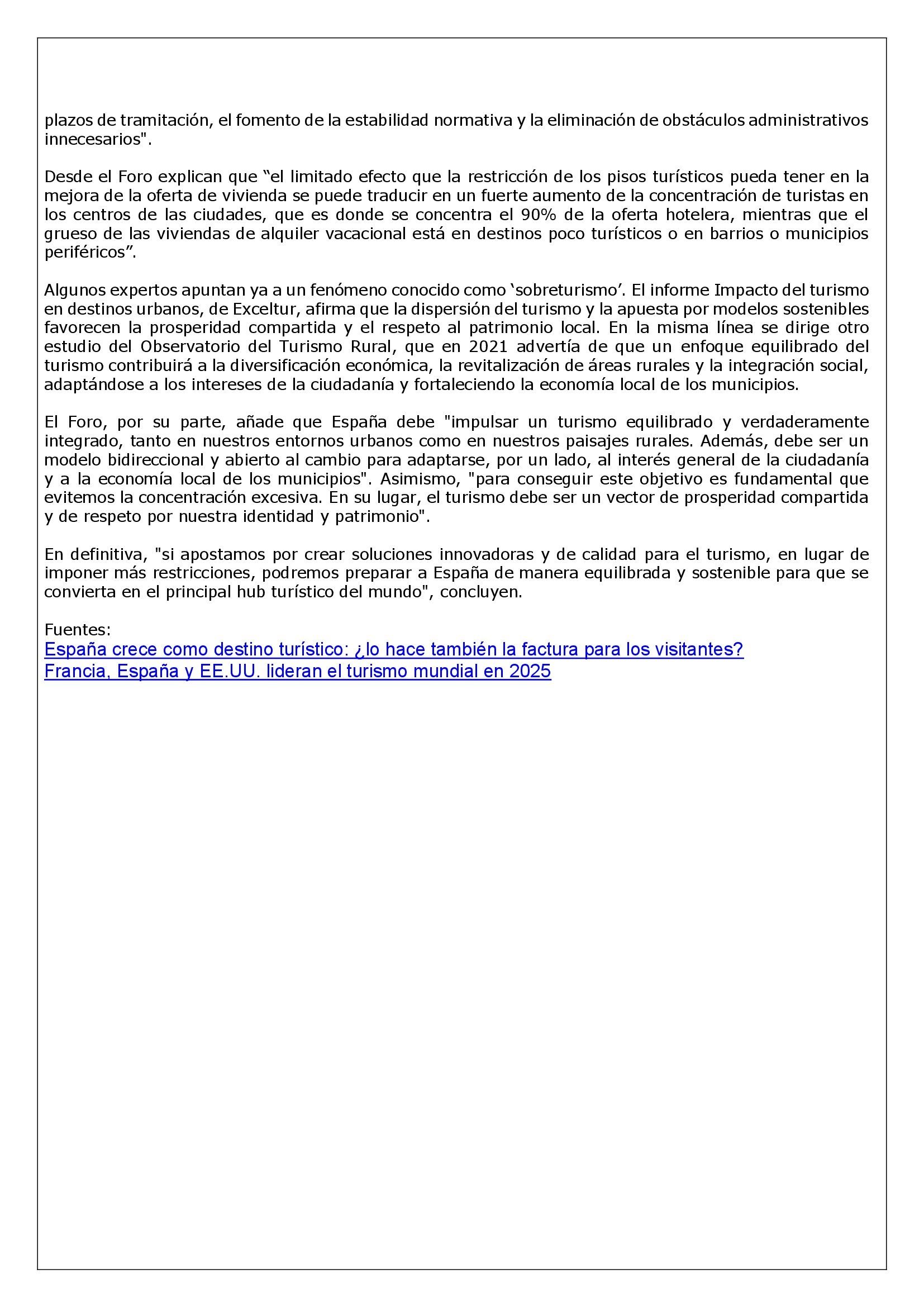 El Foro, por su parte, añade que España debe «impulsar un turismo equilibrado y verdaderamente integrado, tanto en nuestros entornos urbanos como en nuestros paisajes rurales. Además, debe ser un modelo bidireccional y abierto al cambio para adaptarse, por un lado, al interés general de la ciudadanía y a la economía local de los municipios». Asimismo, «para conseguir este objetivo es fundamental que evitemos la concentración excesiva. En su lugar, el turismo debe ser un vector de prosperidad compartida y de respeto por nuestra identidad y patrimonio».