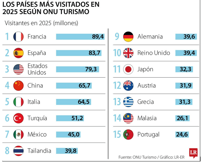 Estados Unidos, por su parte, registra 79,3 millones de llegadas y continúa siendo un destino diverso y multifacético. De la cosmopolita Nueva York a los paisajes naturales del Gran Cañón, el país ofrece experiencias tanto urbanas como rurales, incluyendo parques nacionales, centros históricos, rutas escénicas y destinos de entretenimiento global como Disney World o Hollywood.