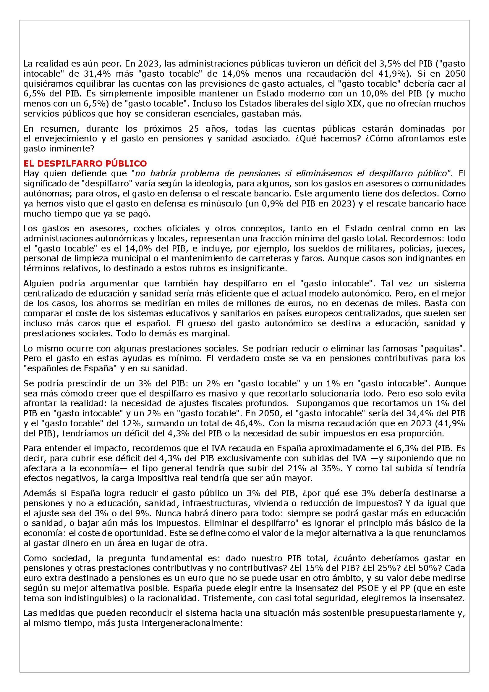 Se podría prescindir de un 3% del PIB: un 2% en «gasto tocable» y un 1% en «gasto intocable». Aunque sea más cómodo creer que el despilfarro es masivo y que recortarlo solucionaría todo. Pero eso solo evita afrontar la realidad: la necesidad de ajustes fiscales profundos. Supongamos que recortamos un 1% del PIB en «gasto intocable» y un 2% en «gasto tocable». En 2050, el «gasto intocable» sería del 34,4% del PIB y el «gasto tocable» del 12%, sumando un total de 46,4%. Con la misma recaudación que en 2023 (41,9% del PIB), tendríamos un déficit del 4,3% del PIB o la necesidad de subir impuestos en esa proporción.