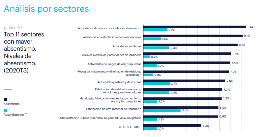 Entre los doce sectores con menor absentismo aparecen apartados como la construcción de edificios, la programación informática, las actividades de I+D, las telecomunicaciones, las ocupaciones de arquitectura e ingeniería o los trabajos dedicados a la contabilidad o el mundo jurídico. Todas estas ramas de actividad no llegan al 3,5% de horas perdidas.