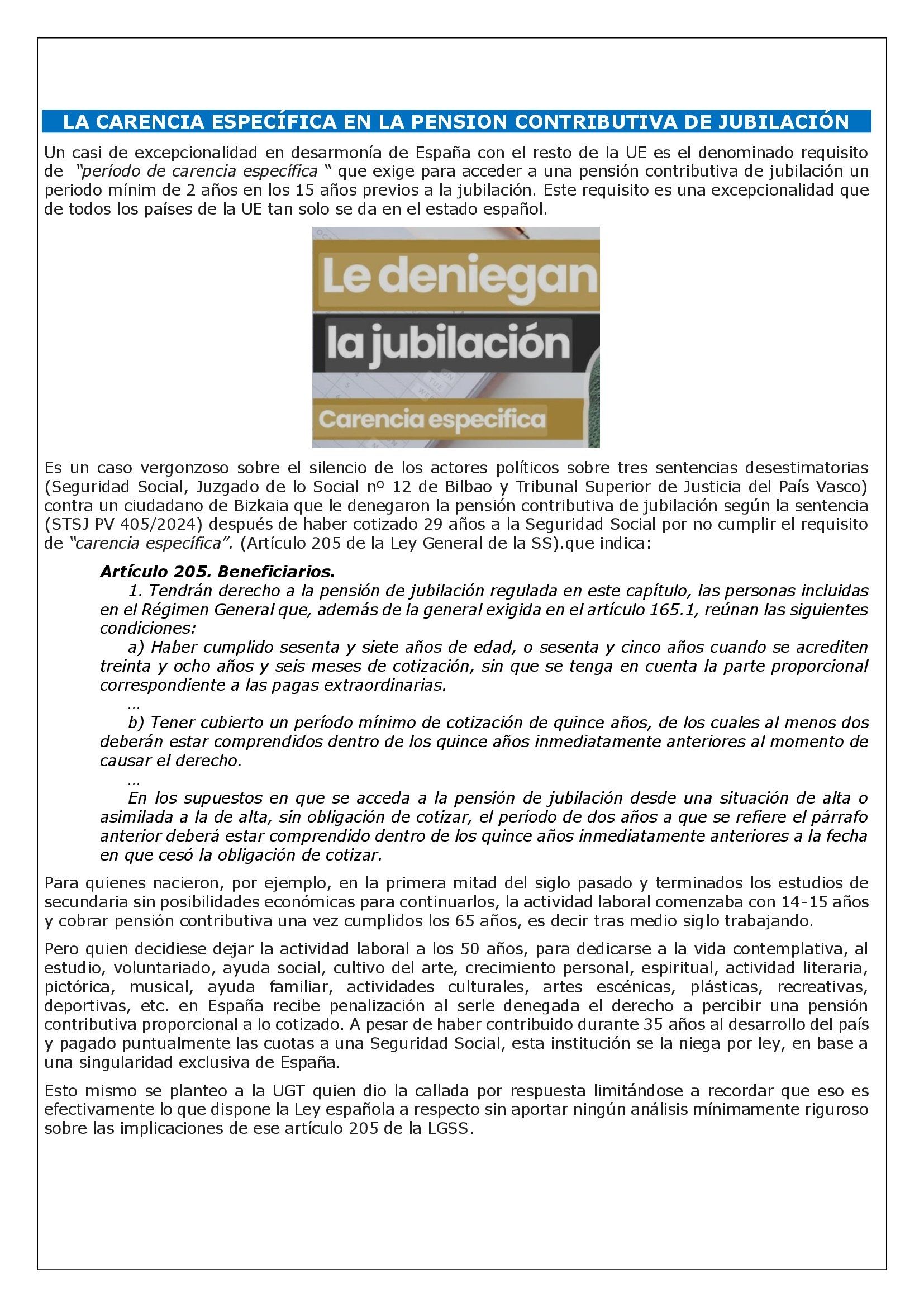 Es un caso vergonzoso sobre el silencio de los actores políticos sobre tres sentencias desestimatorias (Seguridad Social, Juzgado de lo Social nº 12 de Bilbao y Tribunal Superior de Justicia del País Vasco) contra un ciudadano de Bizkaia que le denegaron la pensión contributiva de jubilación según la sentencia (STSJ PV 405/2024) después de haber cotizado 29 años a la Seguridad Social por no cumplir el requisito de “carencia específica”. (Artículo 205 de la Ley General de la SS).que indica: