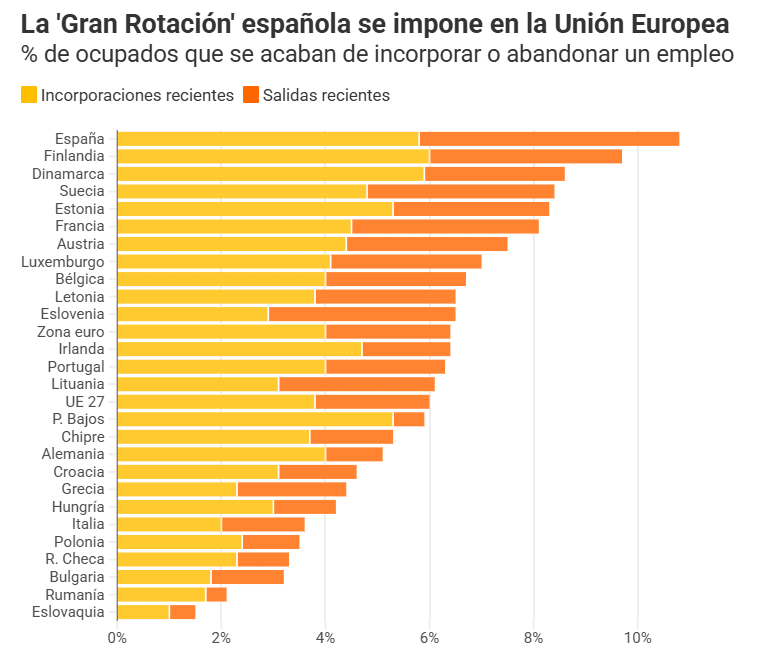La suma de ambas variables arroja en nuestro país una tasa de rotación del empleo del 10,8%, la más elevada de los Veintisiete y, como decíamos, la única que supera el doble dígito. Igual que la tasa de paro.