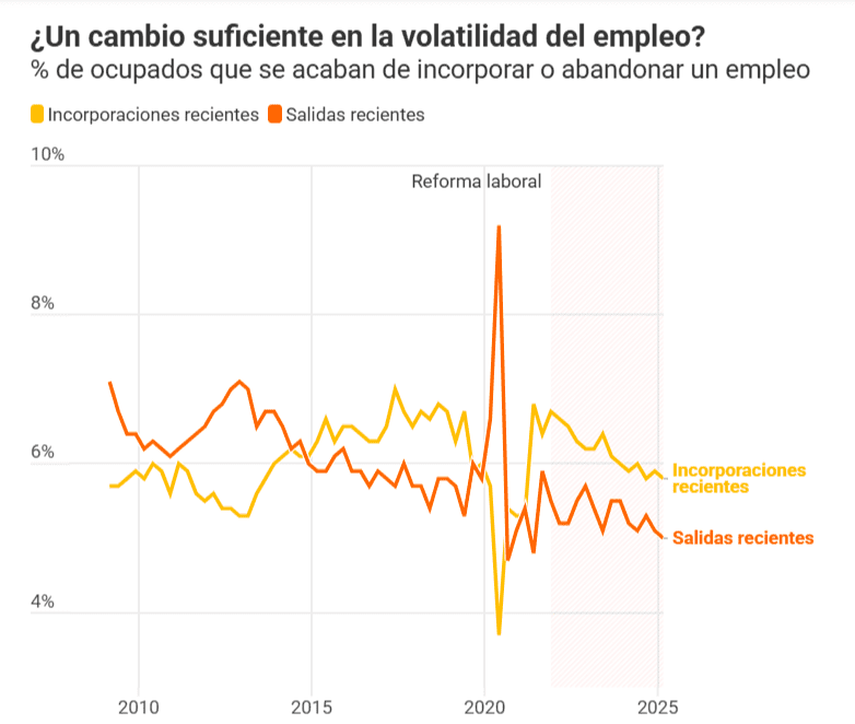La lectura positiva de estos datos es que la volatilidad se está reduciendo, aunque con lentitud: el dato del primer trimestre de 2025, del 10,8%, contrasta con el 12% del mismo periodo de 2019, aunque los datos de 2020 y 2021, marcados por la pandemia, fueron levemente menores que los actuales. Pero lo más llamativo es que este descenso se produce en ambas variables, entradas y salidas, a la vez. Algo que nunca había ocurrido en toda la serie histórica.