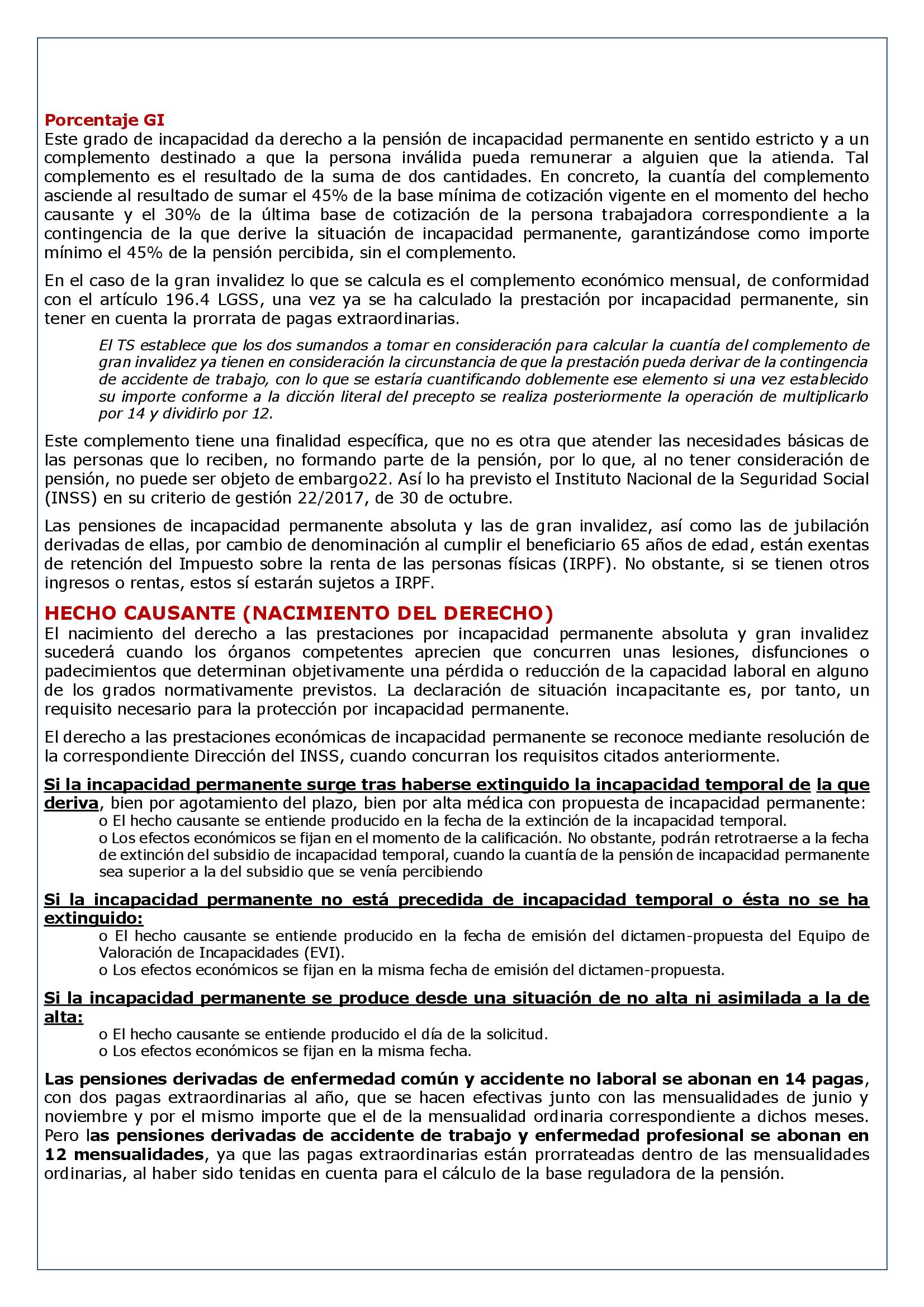Este grado de incapacidad da derecho a la pensión de incapacidad permanente en sentido estricto y a un complemento destinado a que la persona inválida pueda remunerar a alguien que la atienda. Tal complemento es el resultado de la suma de dos cantidades. En concreto, la cuantía del complemento asciende al resultado de sumar el 45% de la base mínima de cotización vigente en el momento del hecho causante y el 30% de la última base de cotización de la persona trabajadora correspondiente a la contingencia de la que derive la situación de incapacidad permanente, garantizándose como importe mínimo el 45% de la pensión percibida, sin el complemento.