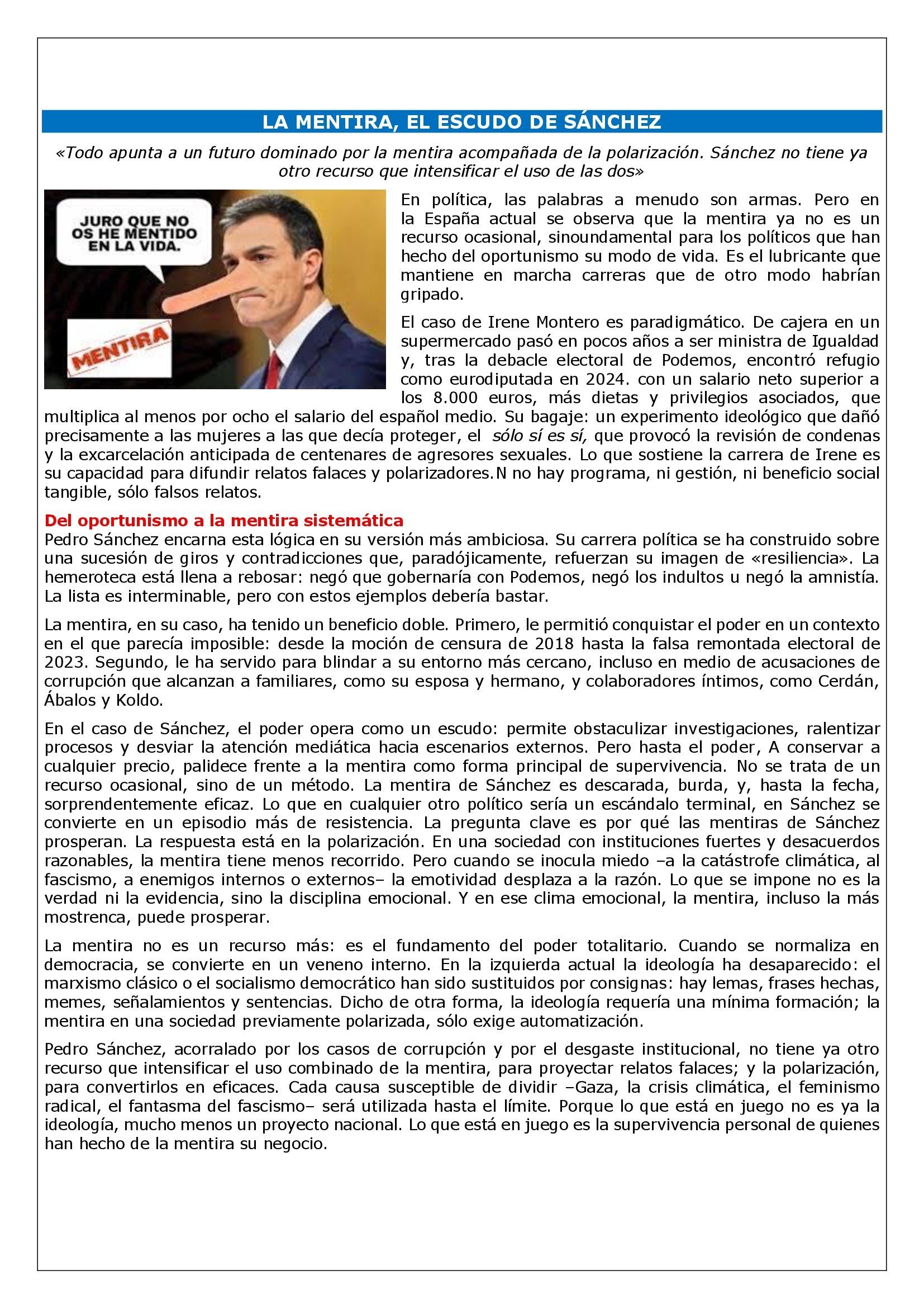Pedro Sánchez, acorralado por los casos de corrupción y por el desgaste institucional, no tiene ya otro recurso que intensificar el uso combinado de la mentira, para proyectar relatos falaces; y la polarización, para convertirlos en eficaces. Cada causa susceptible de dividir –Gaza, la crisis climática, el feminismo radical, el fantasma del fascismo– será utilizada hasta el límite. Porque lo que está en juego no es ya la ideología, mucho menos un proyecto nacional. Lo que está en juego es la supervivencia personal de quienes han hecho de la mentira su negocio.