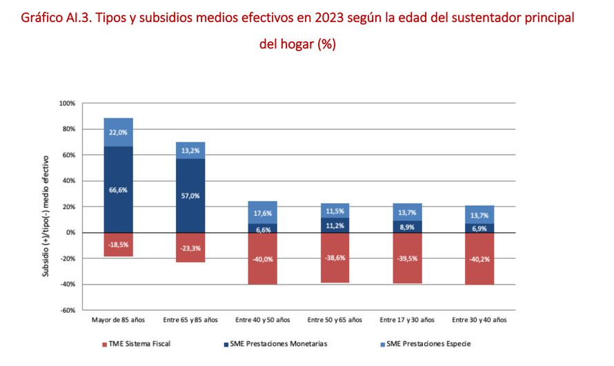 La brecha refleja que el sistema redistribuye no sólo entre niveles de renta, sino también entre generaciones. Algo que se confirma cuando se analizan los tipos y subsidios medios efectivos según la principal fuente de ingresos, con los pensionistas como primeros beneficiarios.